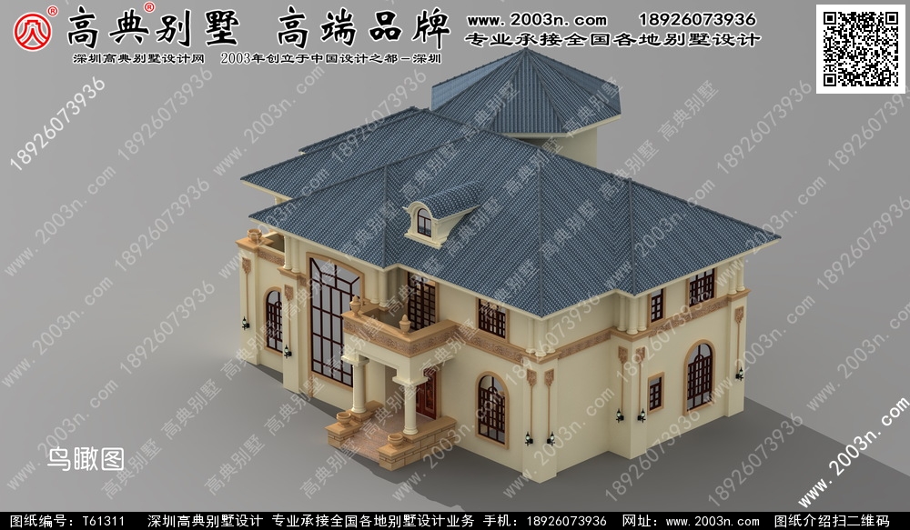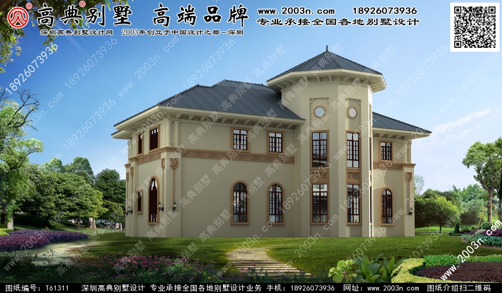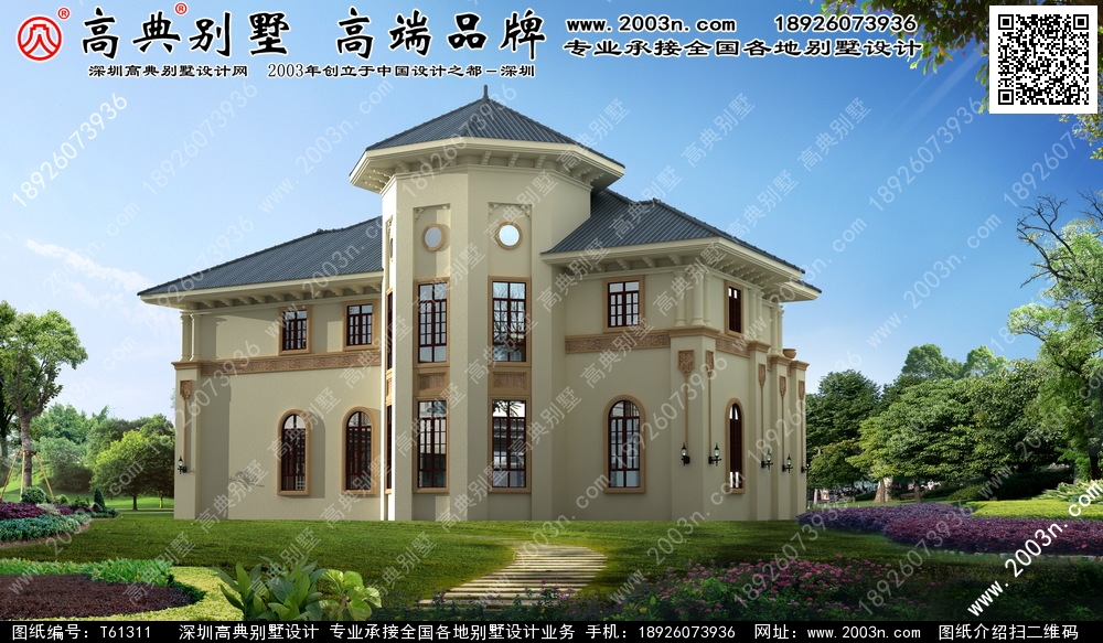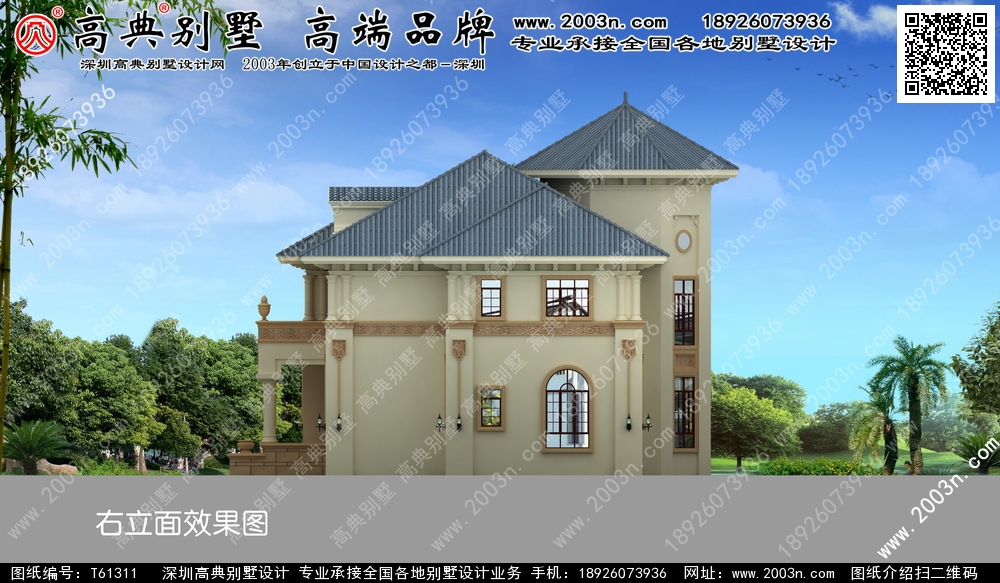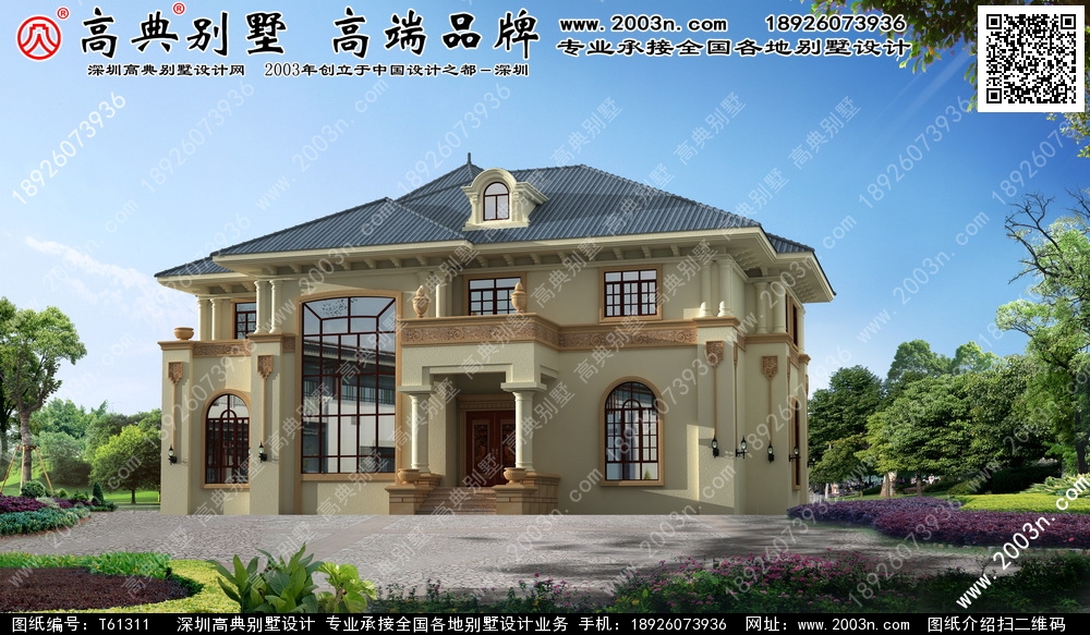 t61311号别墅外墙主要材料:外墙涂料、GRC水泥构件、西瓦、砂岩石、砂岩石浮雕