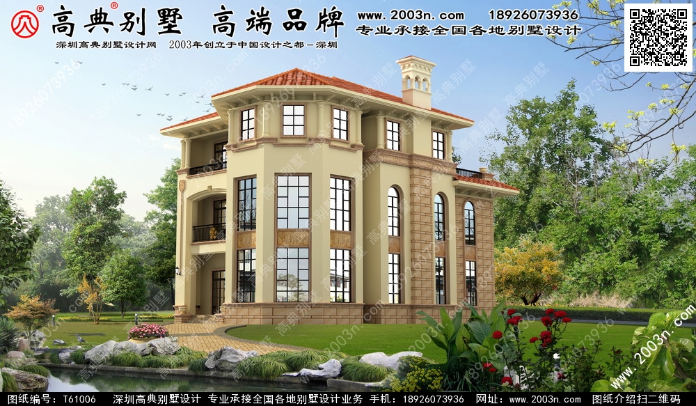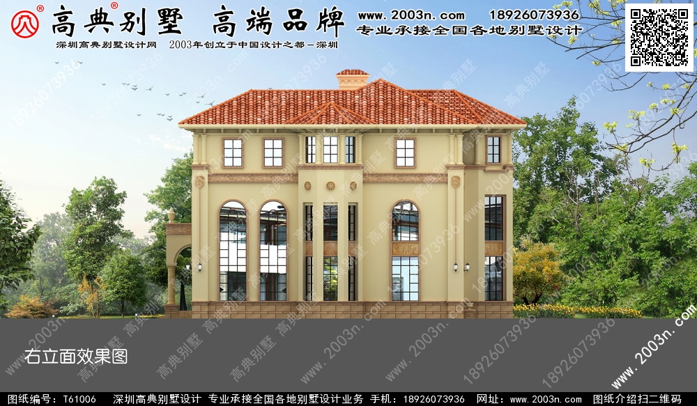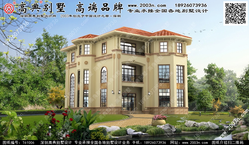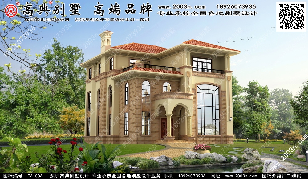 t61006号别墅外墙主要建筑材料:天然岩石漆、天然砂岩石板材、天然砂岩石浮雕、310X310 S瓦、GRC水泥构件、铁艺栏杆