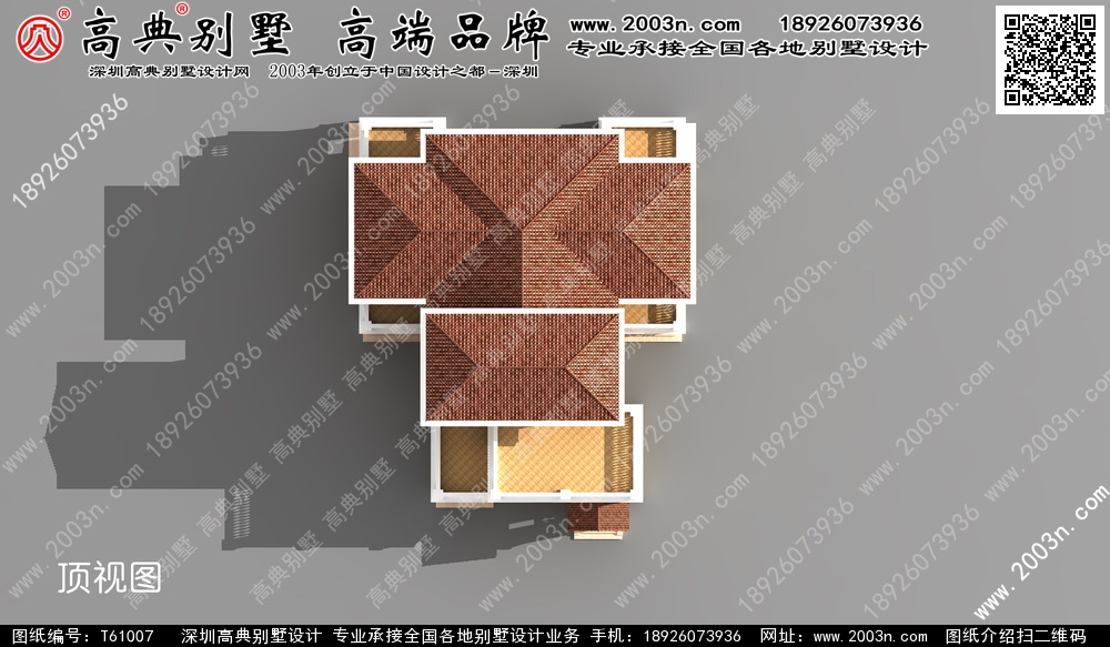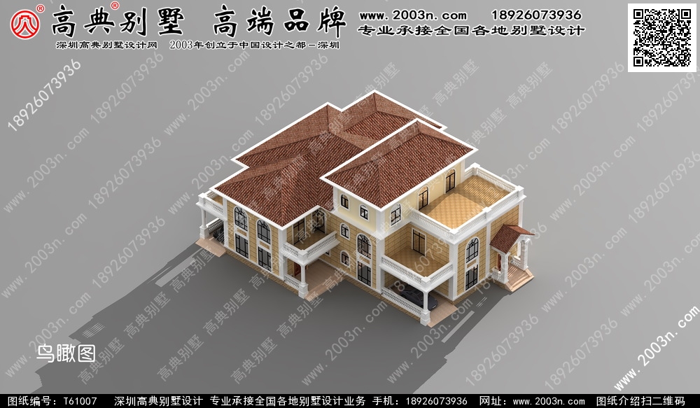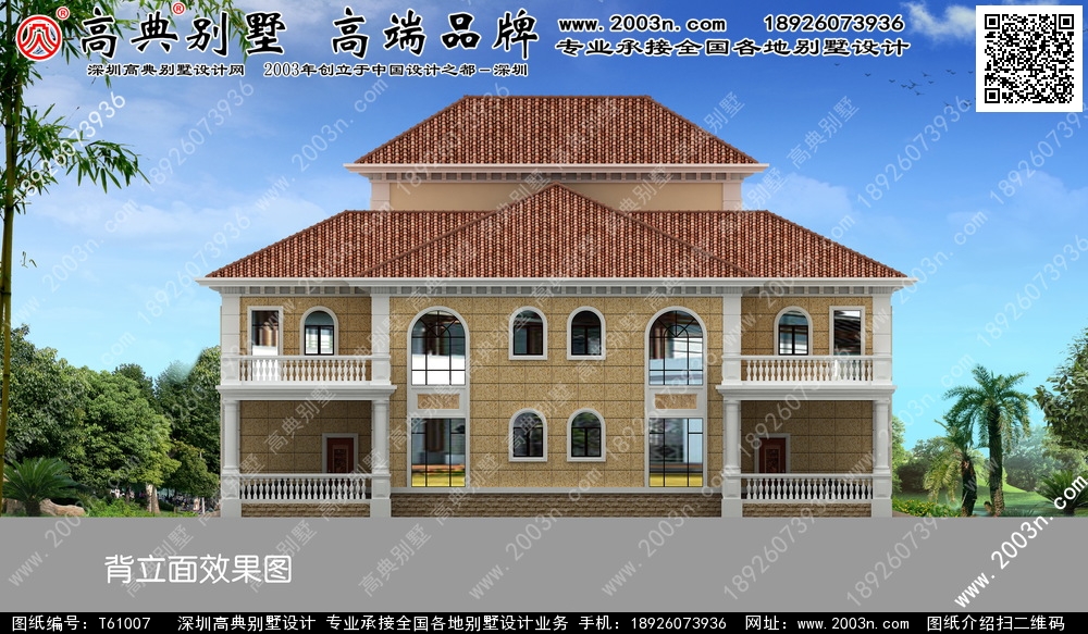 t61007号别墅外墙主要建筑材料:天然岩石漆、天然砂岩石、天然砂岩石浮雕、墙裙蘑菇石、310X310 S瓦、GRC水泥构件、黄锈石