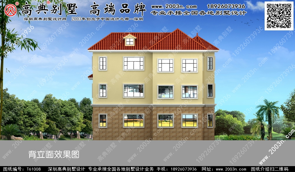 t61008号别墅外墙主要材料:外墙涂料、西瓦、天然砂岩石、铁艺栏杆