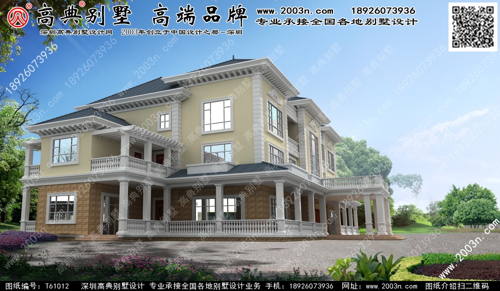 t61012号别墅外墙主要材料:外墙涂料、GRC水泥构件、西瓦、砂岩石