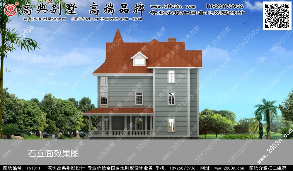 t61016号别墅外墙主要建筑材料:天然岩石漆、一层前面外墙火山石、门廊实心大理石柱、屋面玻纤瓦、外墙PVC挂板或天然岩石漆、墙裙磨菇石