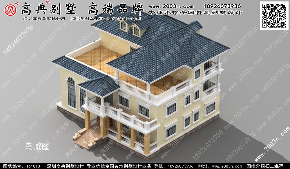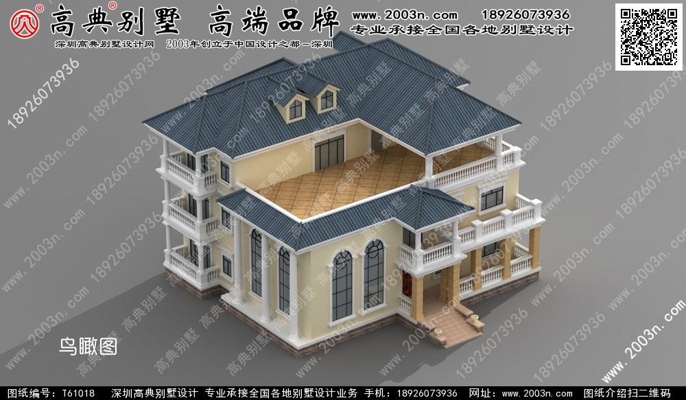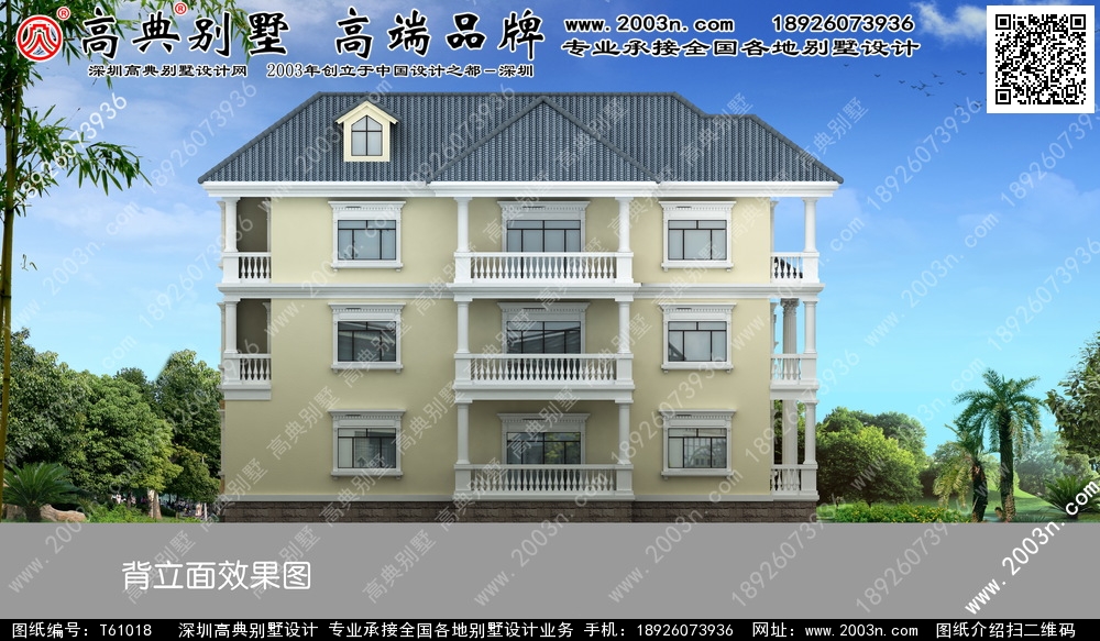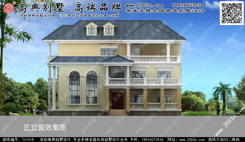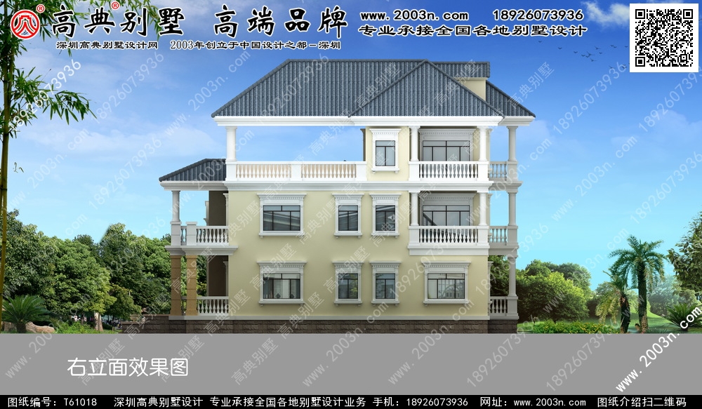 t61018号别墅外墙主要材料:外墙涂料、西瓦、墙裙灰色蘑菇石、黄锈石