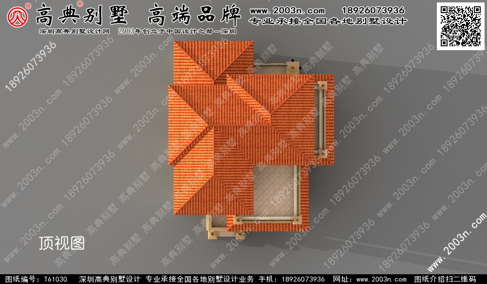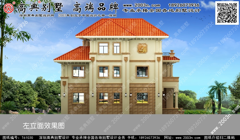 t61030号别墅外墙材料:天然岩石漆、天然砂岩石板材、天然砂岩石浮雕、310X310 S瓦、GRC水泥构件、铁艺栏杆