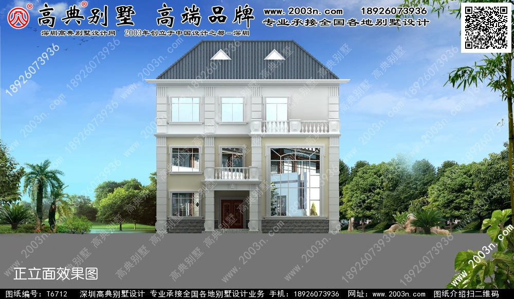 t6712号别墅外墙主要材料:外墙涂料、西瓦、GRC水泥葫芦柱、GRC窗套装饰线、蘑菇石