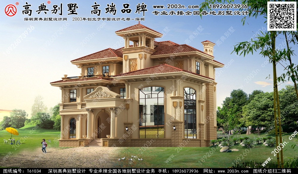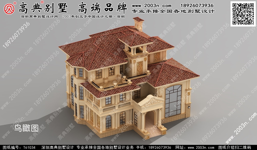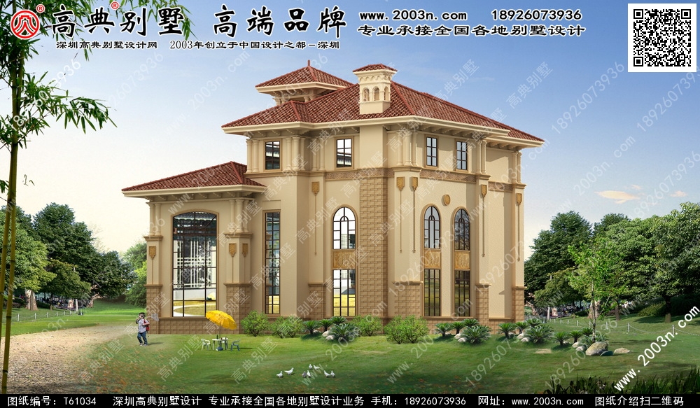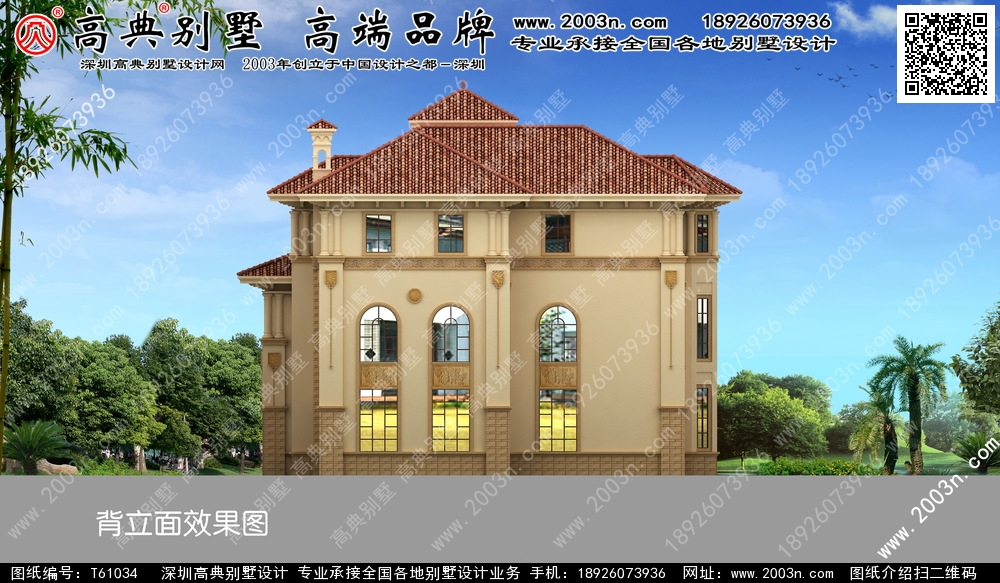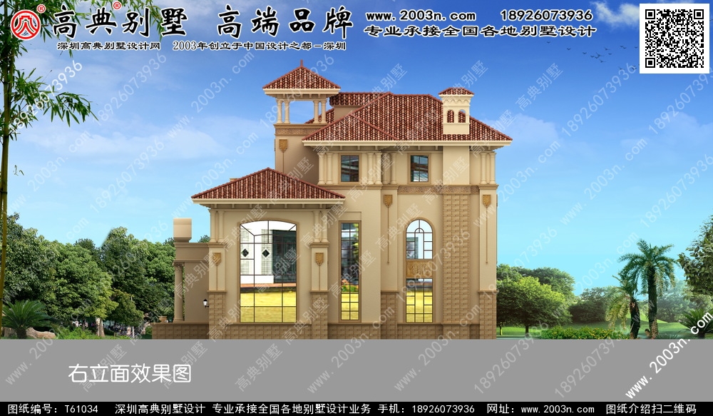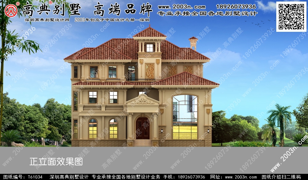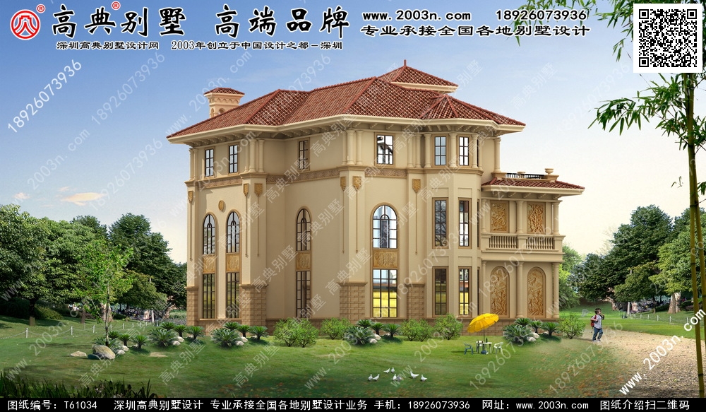 t61034号别墅外墙主要建筑材料:天然岩石漆、天然砂岩石、天然砂岩石浮雕、西班牙筒瓦、GRC水泥构件、铁艺栏杆