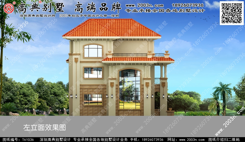 t61036号别墅外墙材料:天然岩石漆、天然砂岩石板材、天然砂岩石浮雕、310X310 S瓦、GRC水泥构件、铁艺栏杆