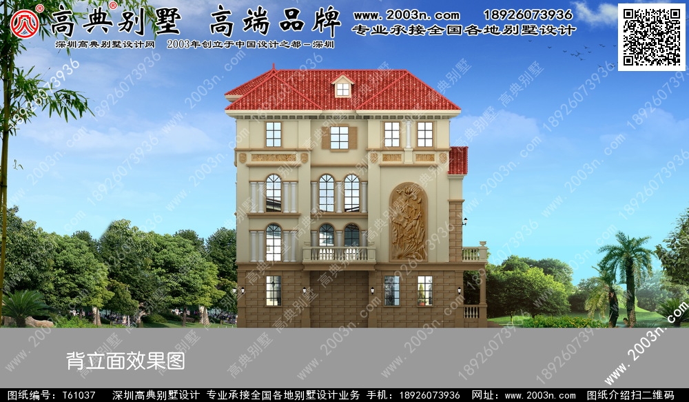 t61037号别墅外墙主要材料:首层外墙贴砂岩石、二三四层外墙天然岩石漆、砂岩石浮雕、屋面西瓦、GRC构件