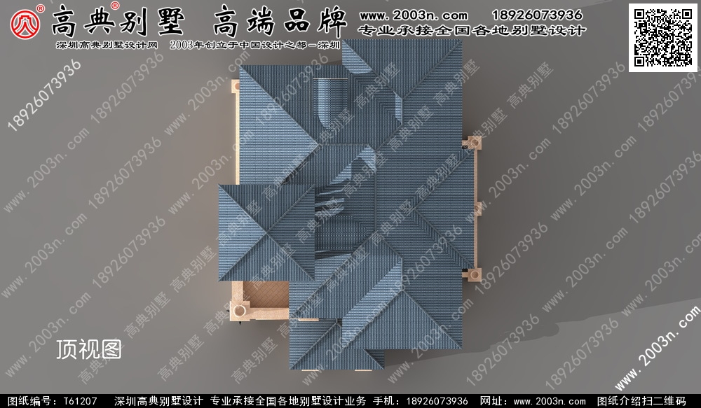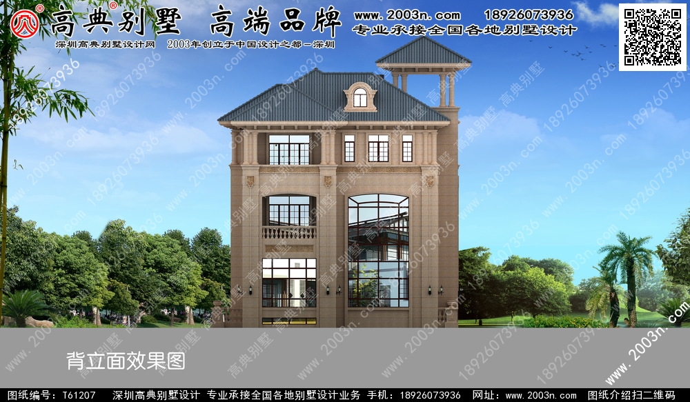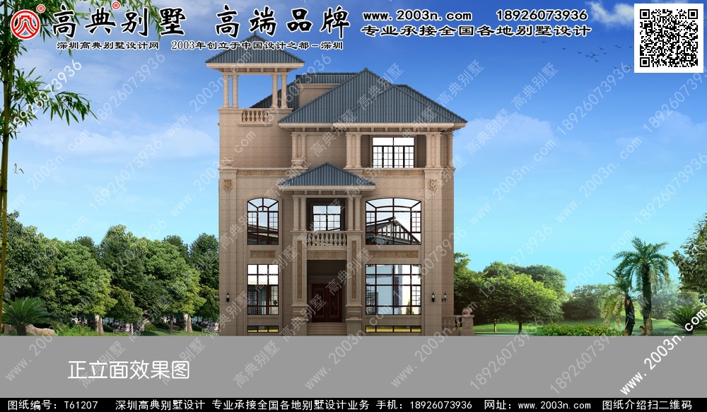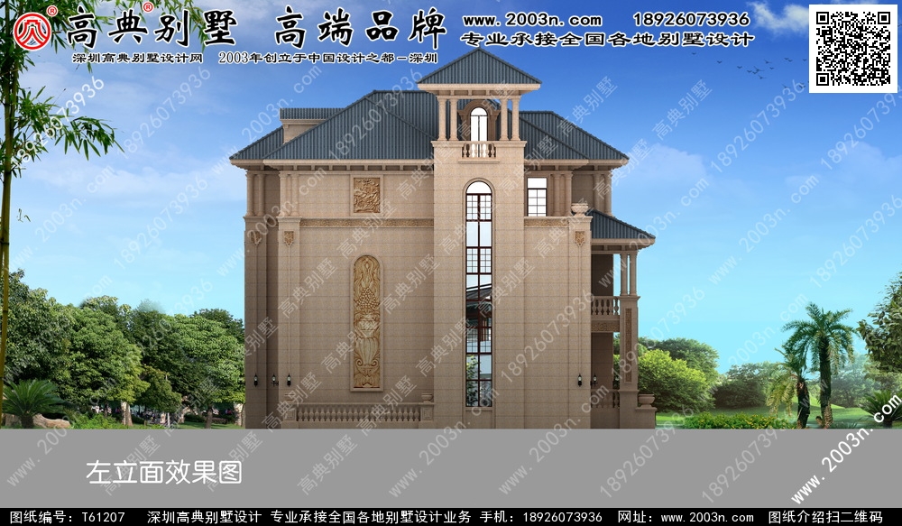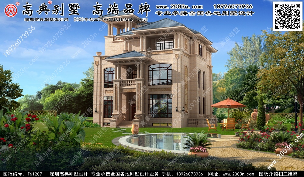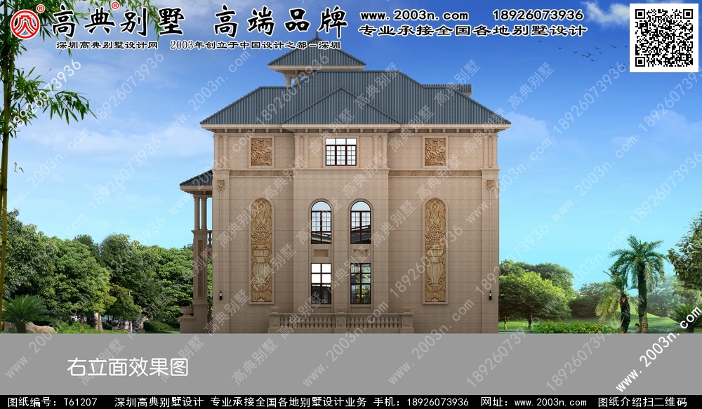 t61207号别墅外墙全部采用荔枝面沙漠棕石材干挂、外墙纯石材别墅、屋面用310X310S瓦