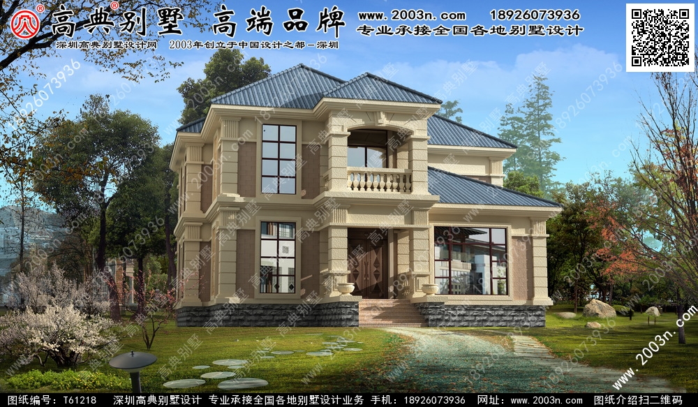 t61218号别墅外墙主要材料:外墙涂料、GRC水泥构件、西瓦、墙裙蘑菇面麻石