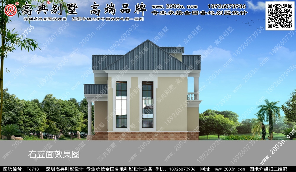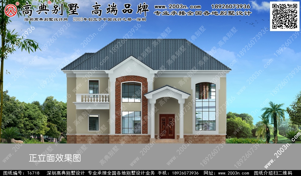 t6718号别墅外墙主要材料:外墙真石漆、水泥构件葫芦柱栏杆、外墙砖、S瓦、水泥构件窗套