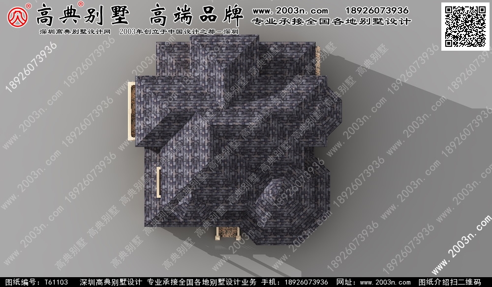 t61103号别墅外墙主要材料:外墙真石漆、外墙文化石、屋面玻纤瓦、墙裙蘑菇石