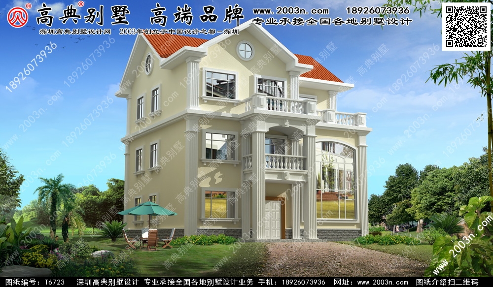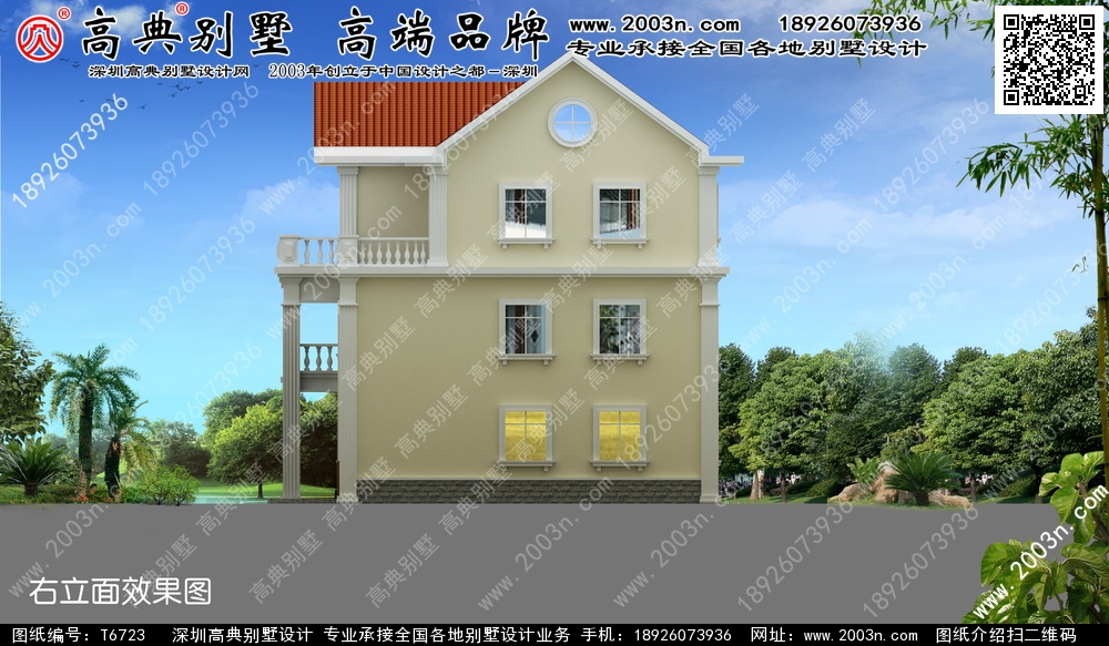 t6723号别墅外墙主要材料:外墙真石漆、S瓦、GRC水泥葫芦柱、蘑菇石
