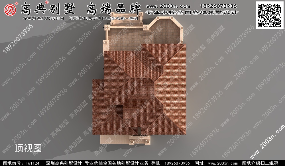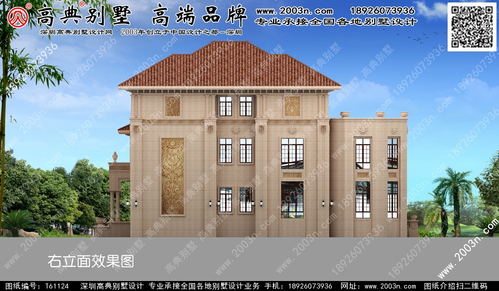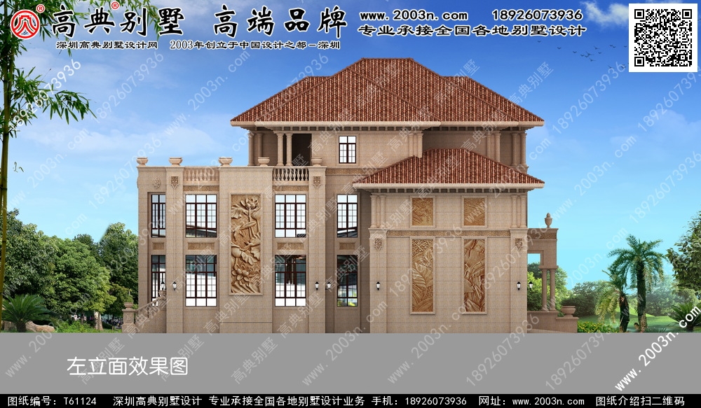 t61124号别墅外墙全部采用福建瑕红石材干挂及天然砂岩石浮雕图案、外墙纯石材别墅、屋面用310X310 S瓦