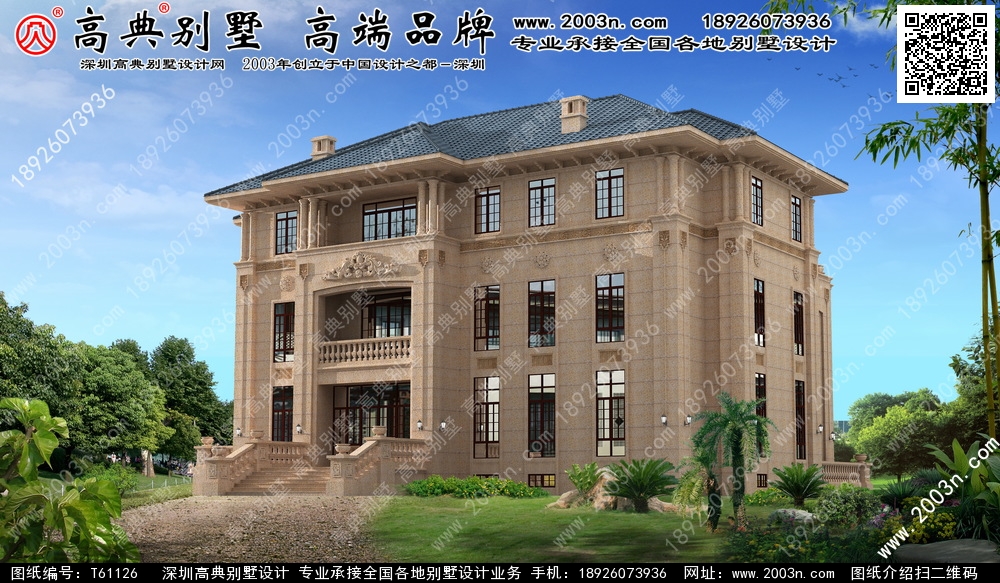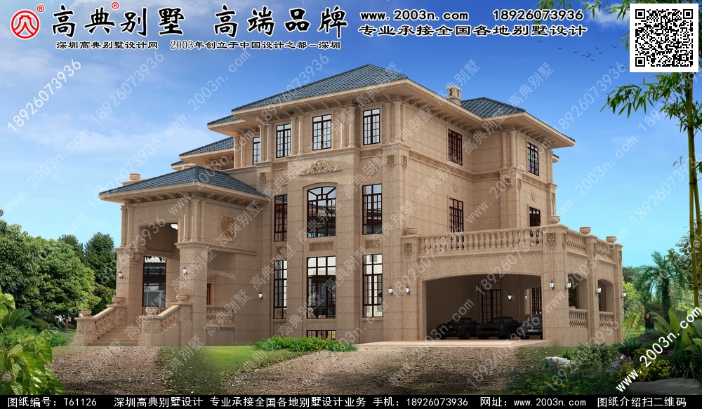 t61126号别墅外墙全部采用沙漠棕石材干挂及天然砂岩石浮雕图案、外墙纯石材别墅、屋面用310X310 S瓦
