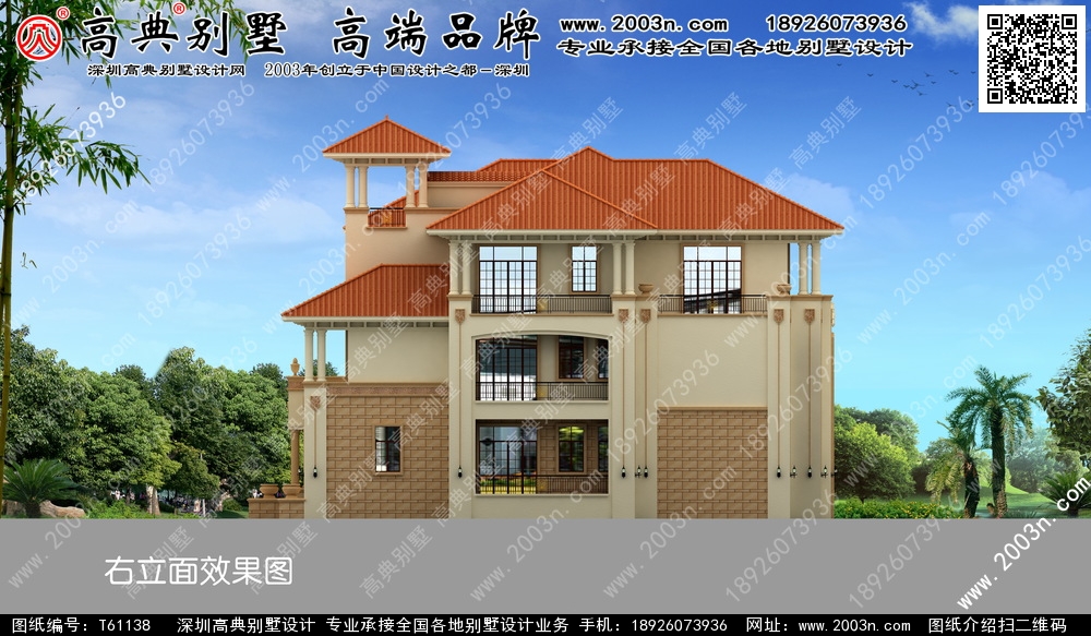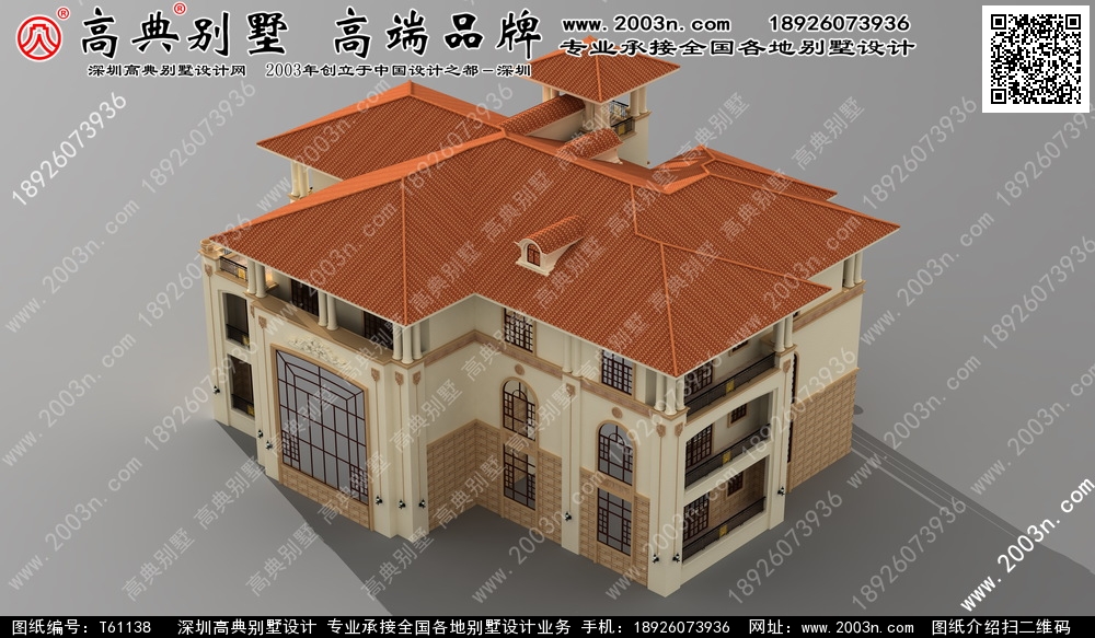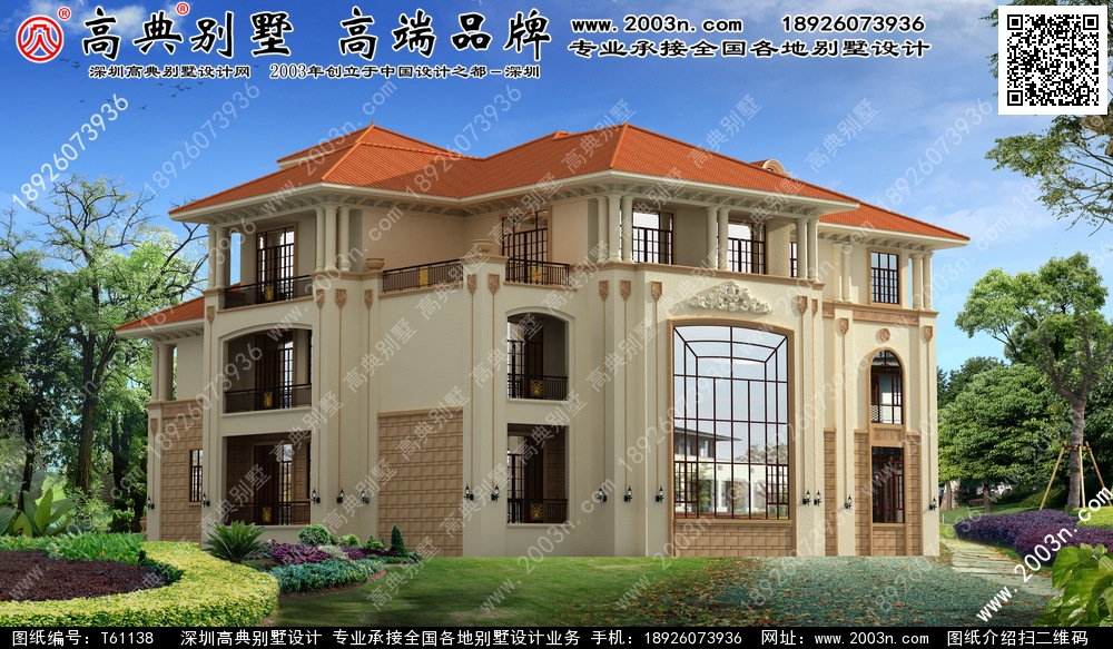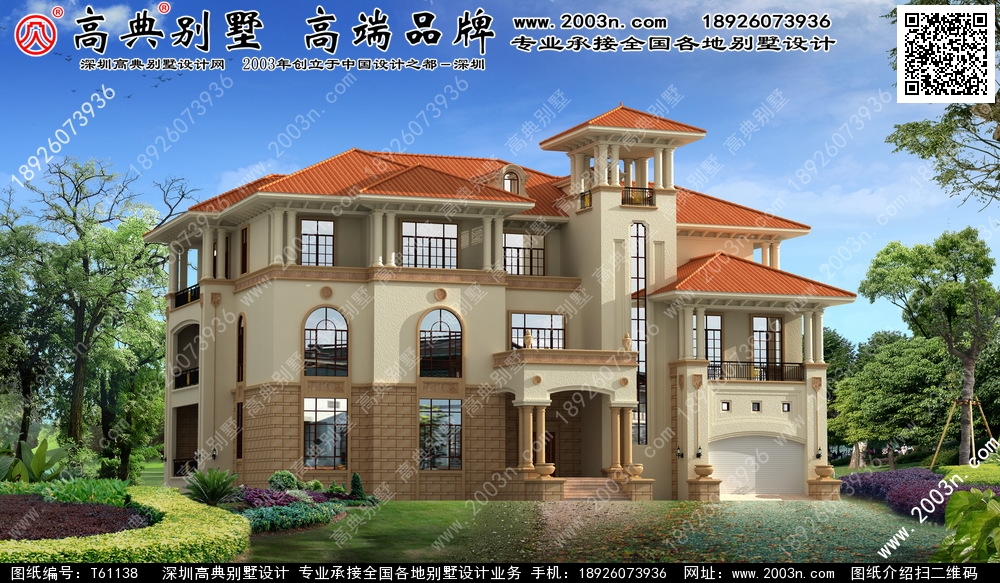 t61138号别墅外墙主要材料:天然岩石漆、天然砂岩石板材、天然砂岩石浮雕、310X310 S瓦、GRC水泥构件、铁艺栏杆