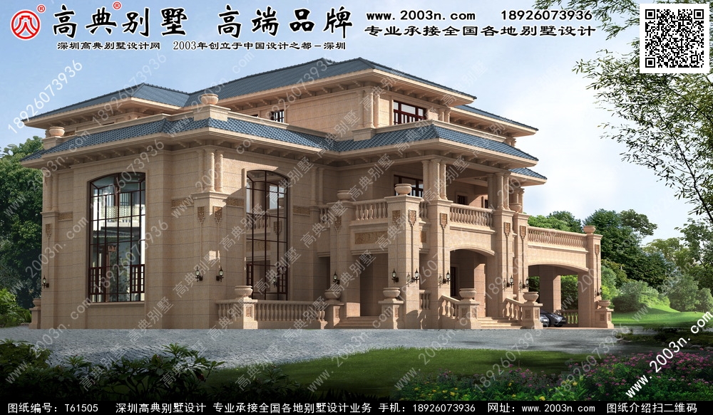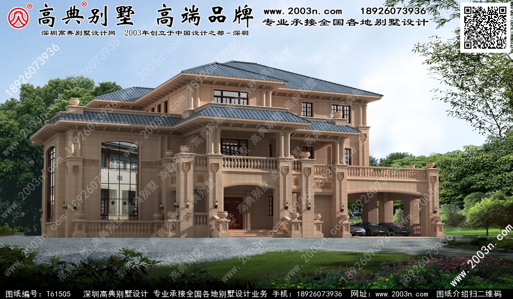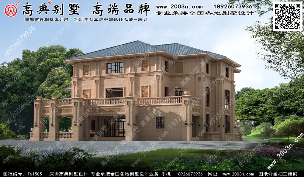 T61505号别墅外墙主要材料: 天然岩澳洲砂岩浮雕、外墙荔枝面沙漠棕石材、屋面310X310S瓦