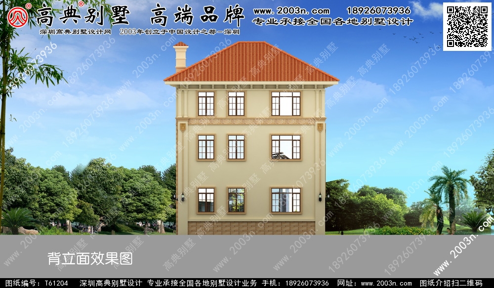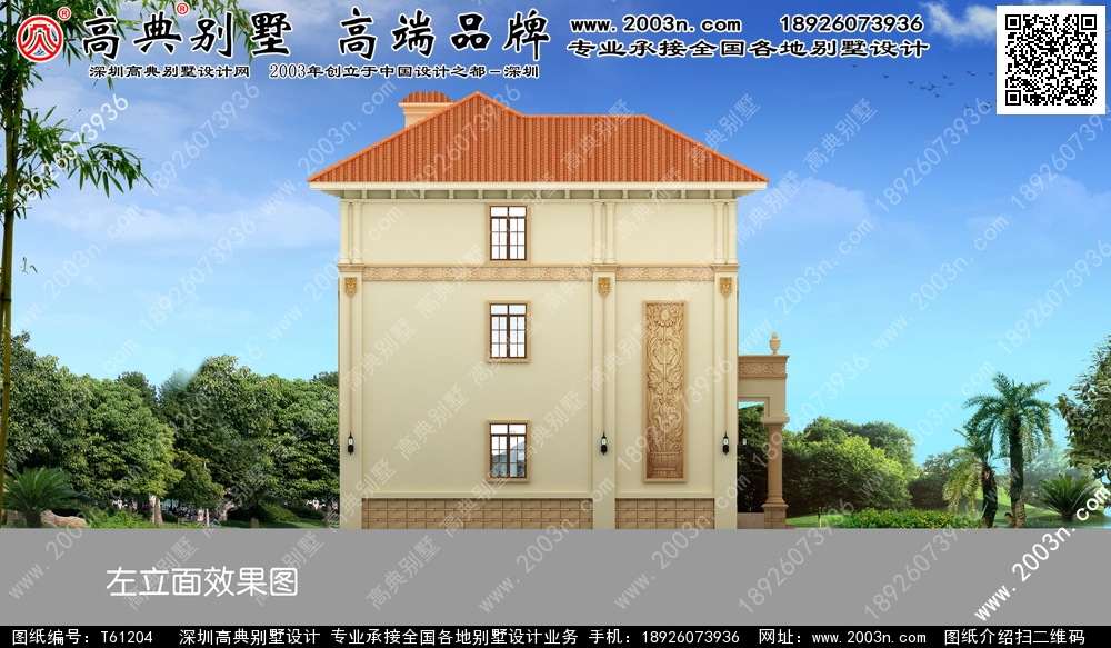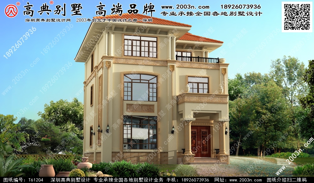 t61204号别墅外墙主要材料:外墙涂料、西瓦、砂岩石、砂岩石浮雕