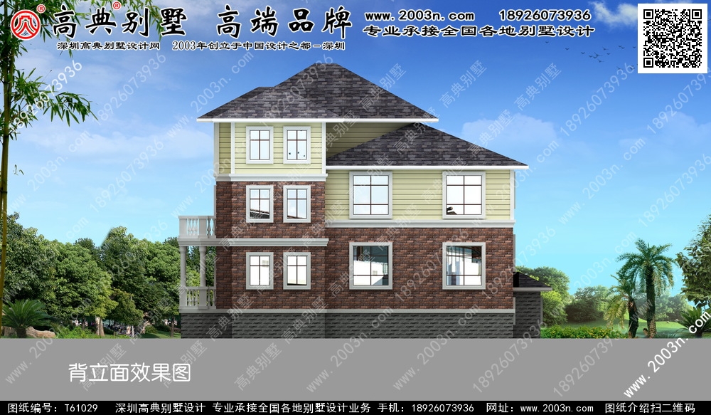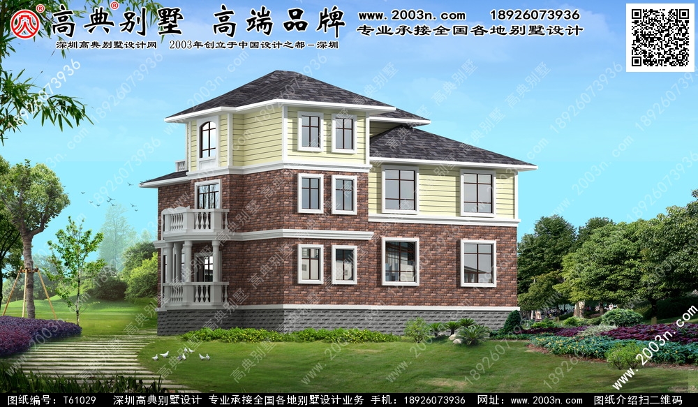 此t61029号别墅外墙主要材料:外墙真石漆、劈开砖、水泥瓦、GRC水泥葫芦柱、蘑菇石