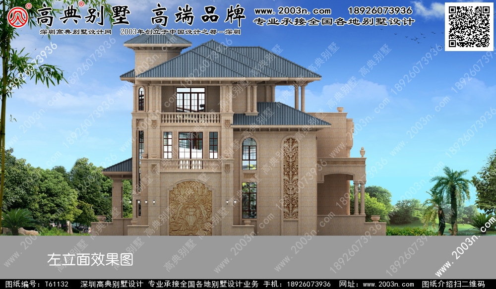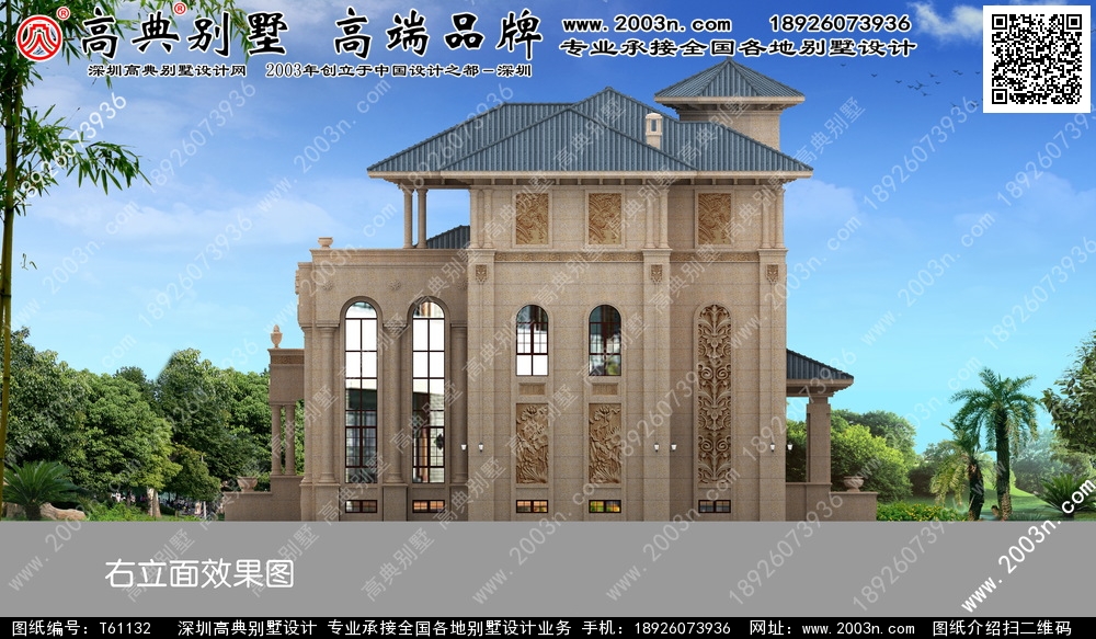t61132号别墅外墙全部采用沙漠棕石材干挂及天然砂岩石浮雕图案、外墙纯石材别墅、屋面用310X310 S瓦