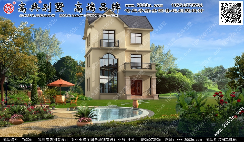 T6306号别墅外墙主要材料:外墙天然岩石漆、铁艺栏杆、大门柱火烧面黄锈石、屋面水泥平板瓦