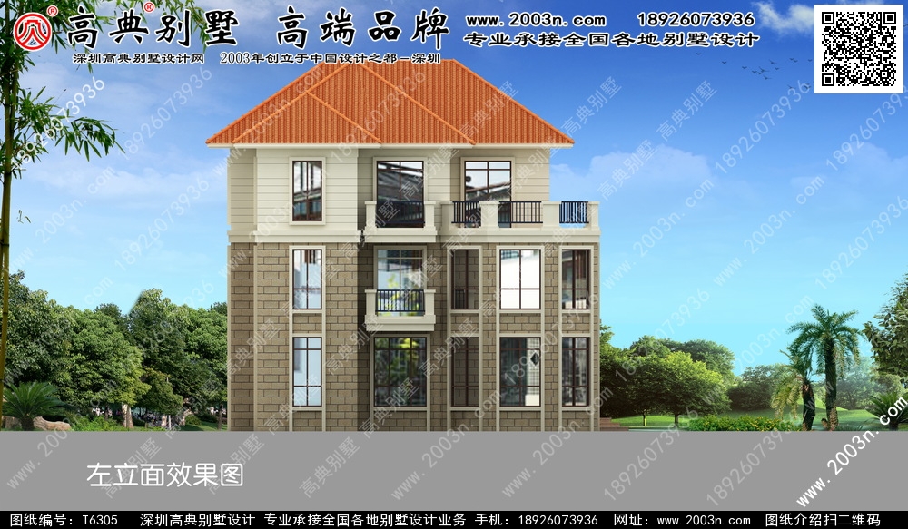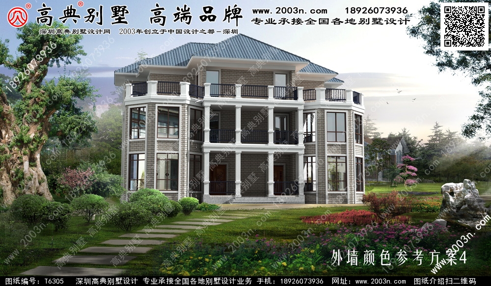 T6305号别墅外墙主要材料:天然岩石漆、铁艺栏杆、外墙仿石砖、屋面310X310S瓦