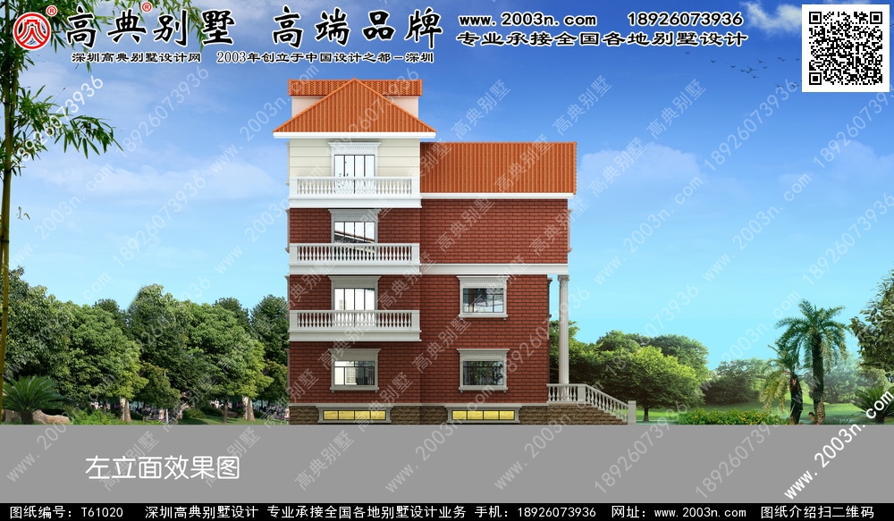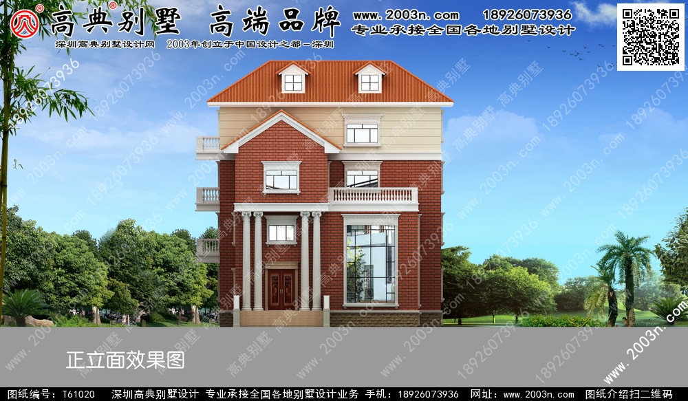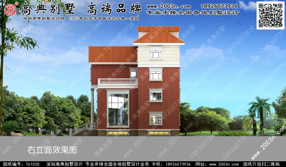此别墅外墙主要材料:外墙涂料、西瓦、红色劈开砖、蘑菇石