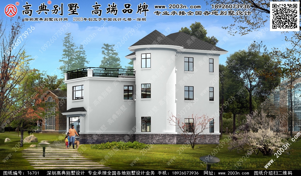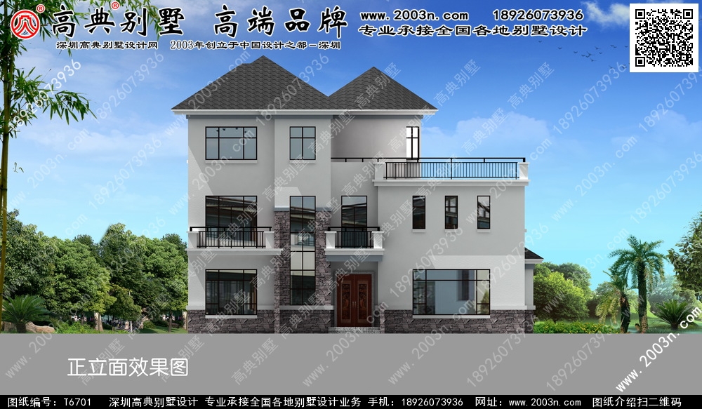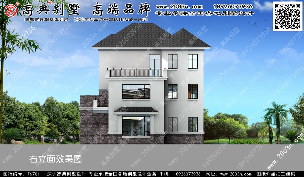 t6701号别墅外墙主要材料:外墙涂料、铁艺栏杆、外墙文化石