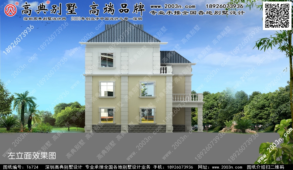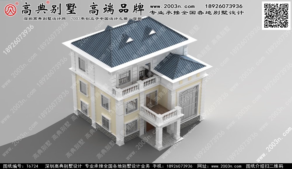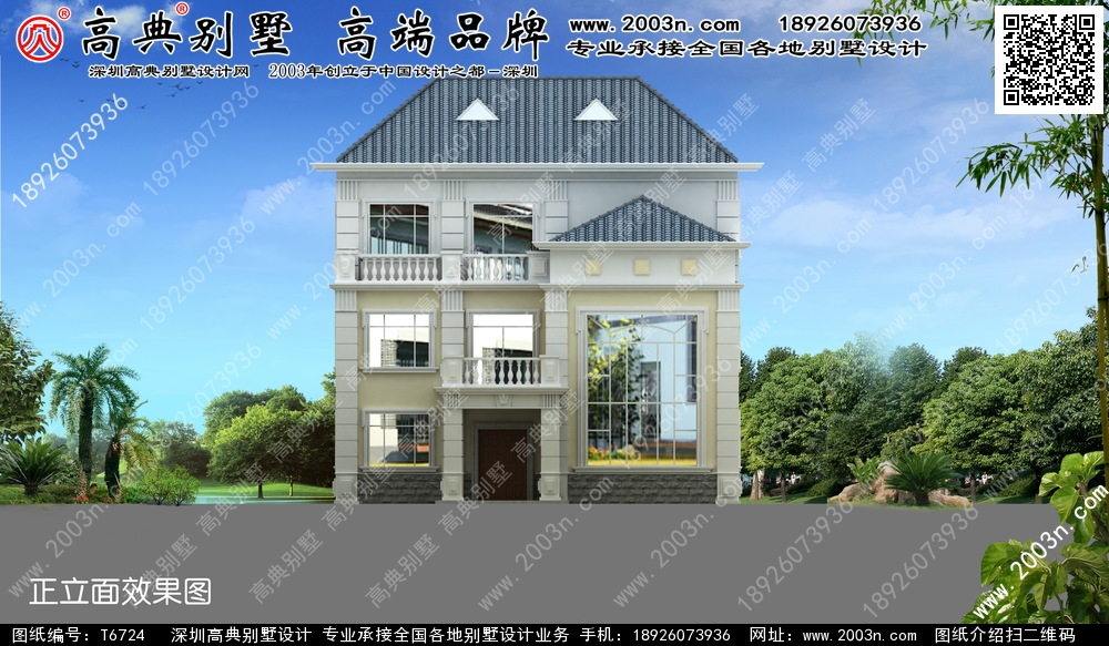 t6724号别墅外墙主要材料:外墙涂料、西瓦、GRC水泥葫芦柱、GRC窗套装饰线、蘑菇石