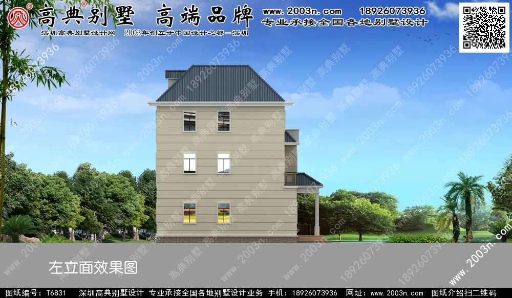 t6831号别墅外墙主要材料:外墙涂料、310X310S瓦、玻璃铁艺栏杆