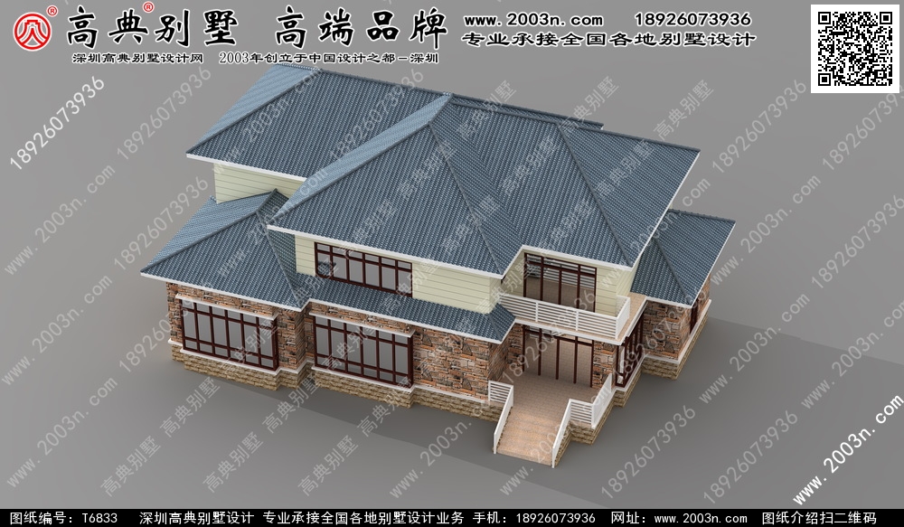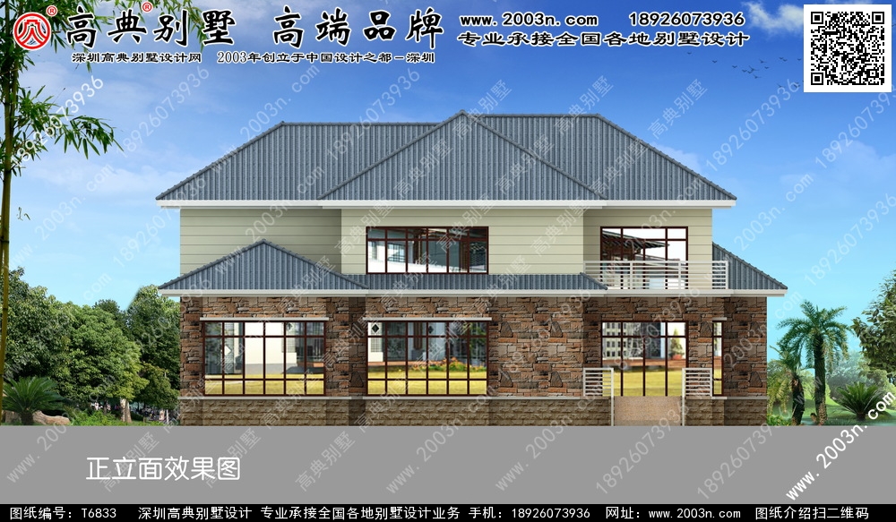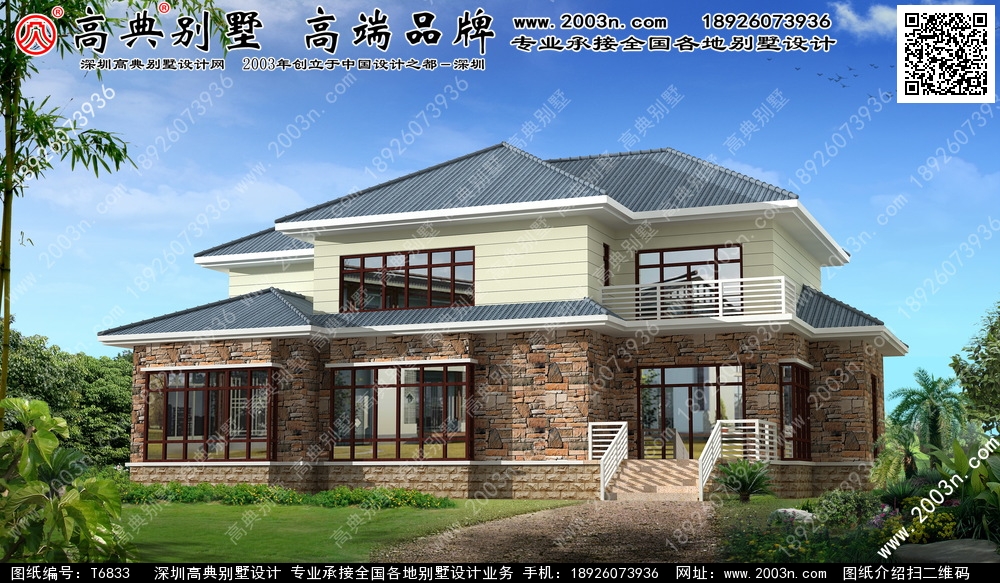 t6833号别墅外墙主要材料:天然岩石漆、外墙文化石、310X310 S瓦、铁艺栏杆、蘑菇石