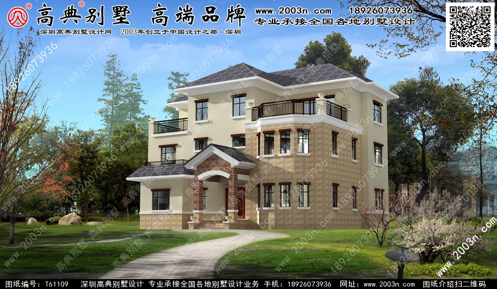t61109号别墅外墙主要材料:外墙涂料、文化石、玻纤瓦、砂岩石