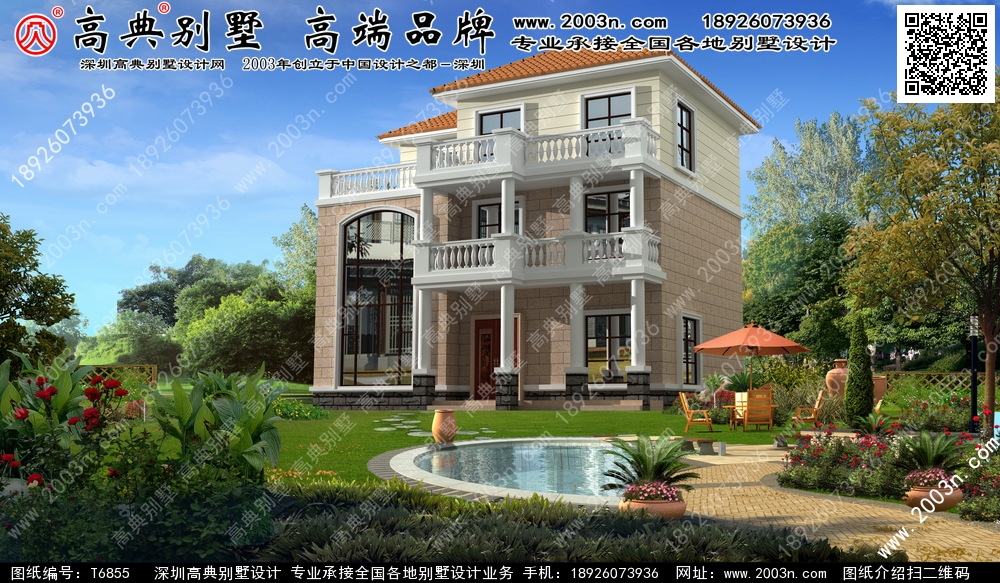 t6855号别墅外墙主要材料:外墙真石漆、仿石材外墙砖、S瓦、GRC水泥葫芦柱、蘑菇石