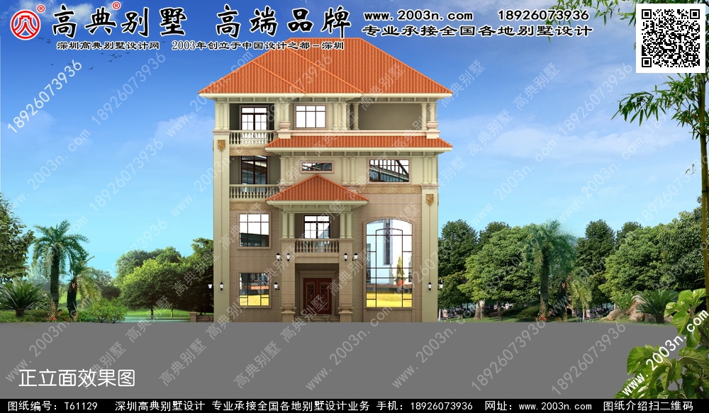 t61129号别墅外墙主要建筑材料:天然岩石漆、火烧面瑕红石材、天然砂岩石浮雕、310X310 S瓦、GRC水泥构件