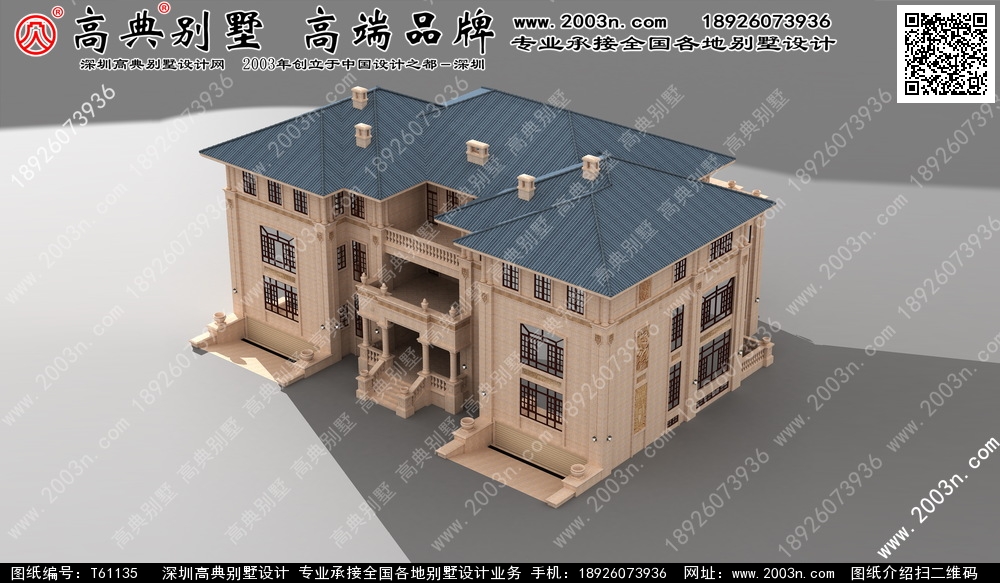 t61135号别墅外墙全部采用沙漠棕石材干挂及天然砂岩石浮雕图案、外墙纯石材别墅、屋面用310X310 S瓦