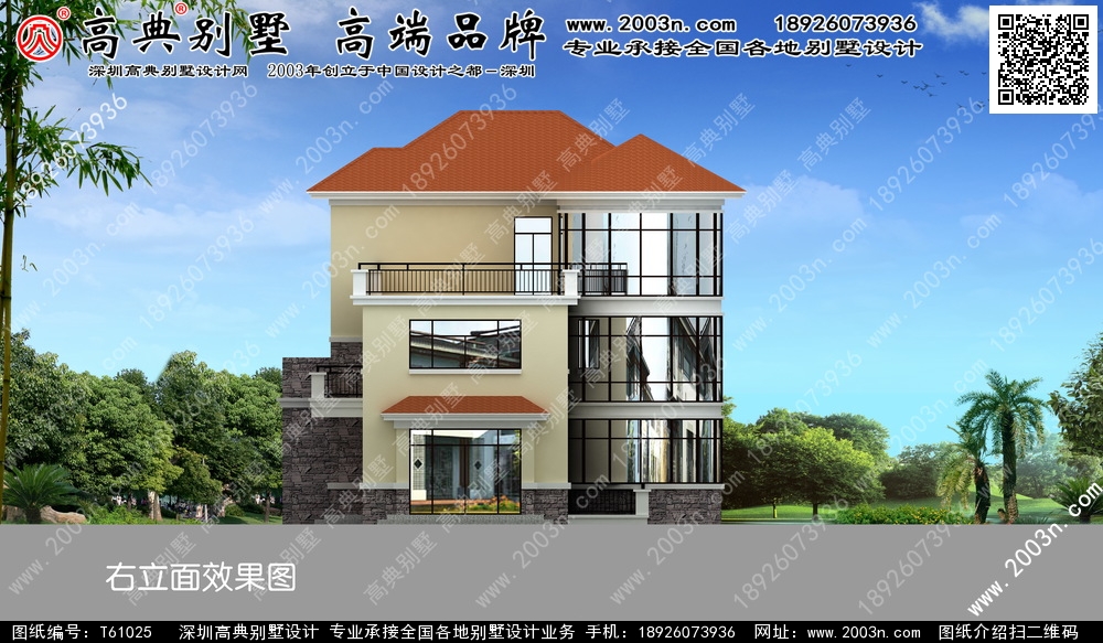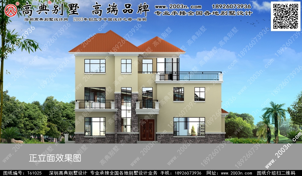 t61025号别墅外墙主要材料:外墙涂料、玻纤瓦、铁艺栏杆、文化石