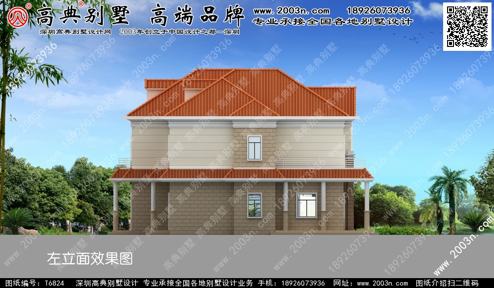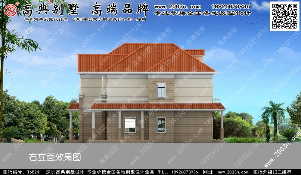 t6824号别墅外墙主要材料:外墙涂料、西瓦、花岗石、蘑菇石