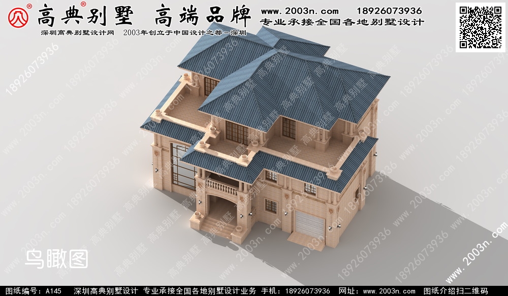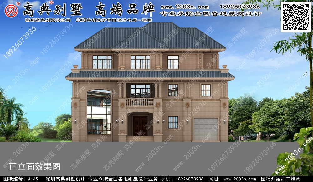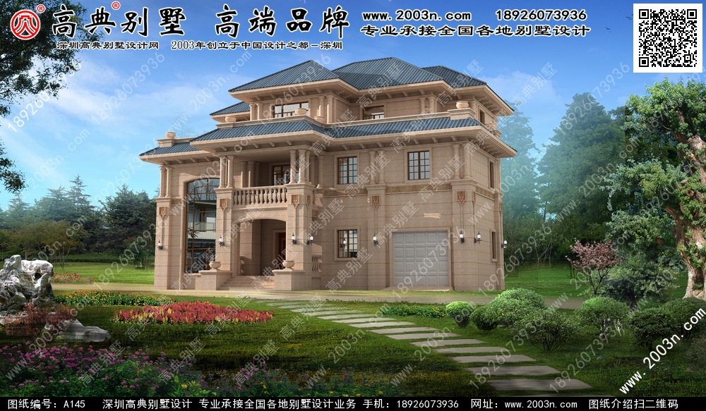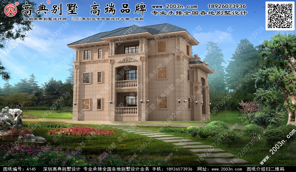 a145号别墅别墅外墙主要材料:外墙纯石材干挂别墅、荔枝面沙漠棕石材、屋面310X310S瓦 |