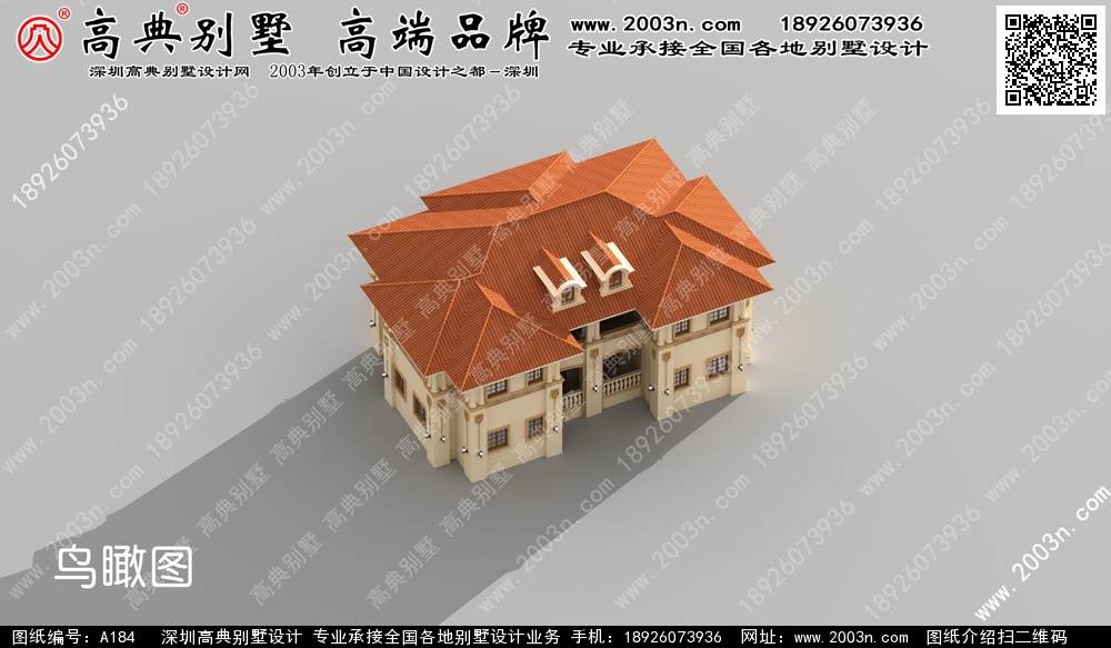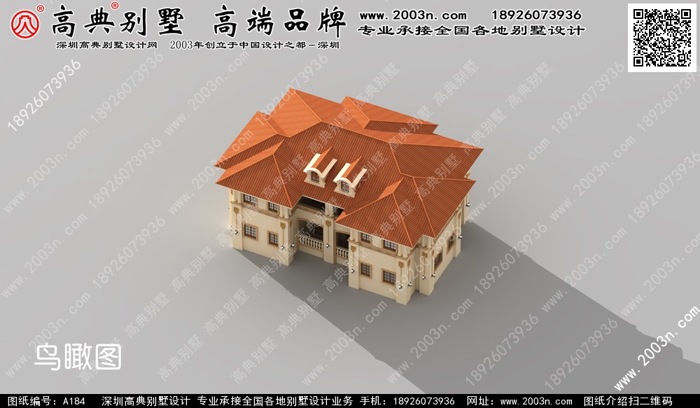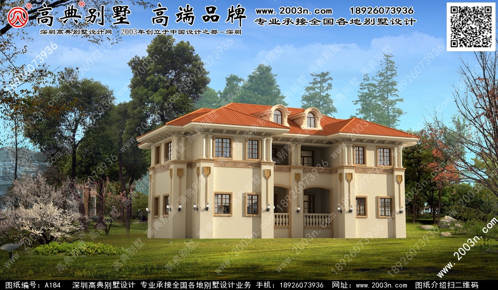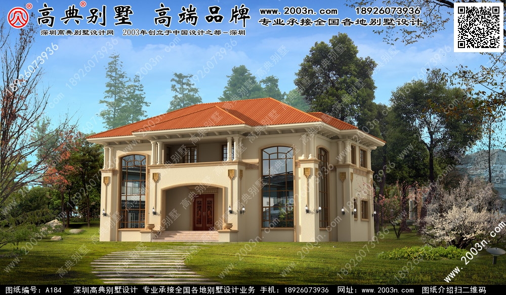 a184号别墅外墙主要材料:天然岩石漆、水泥构件葫芦柱栏杆、欧式水泥构件线条、屋面310X310S瓦 |