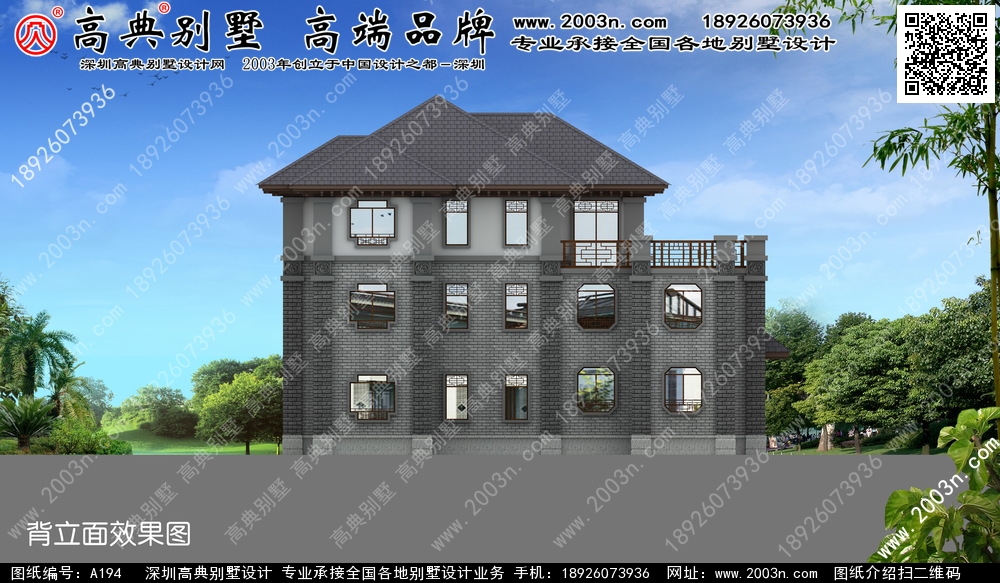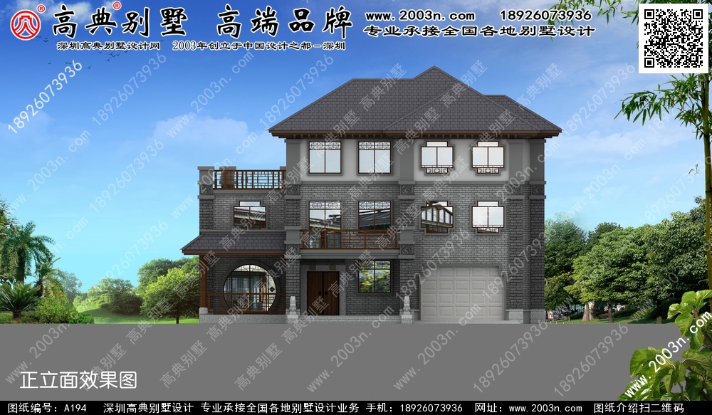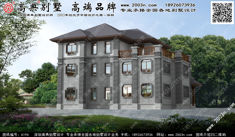 A194号别墅外墙主要材料:水泥平板瓦、真石漆、面砖、麻石 |