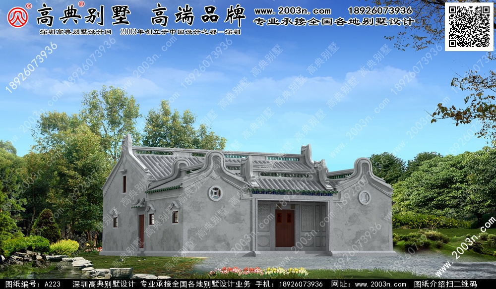 A223号别墅传统户型下山虎外墙主要材料: 仿古青瓦、仿古涂料、白麻石 |