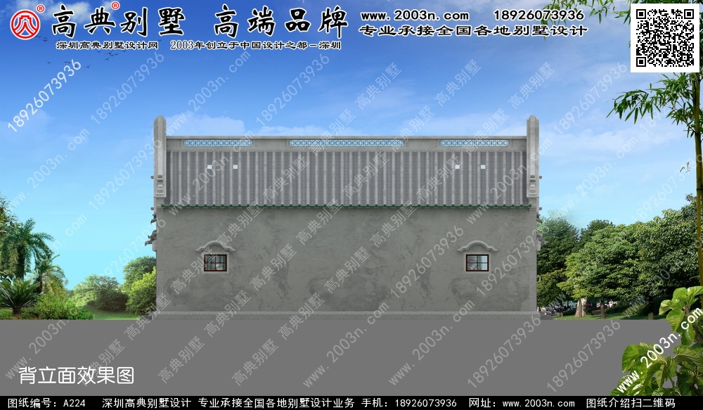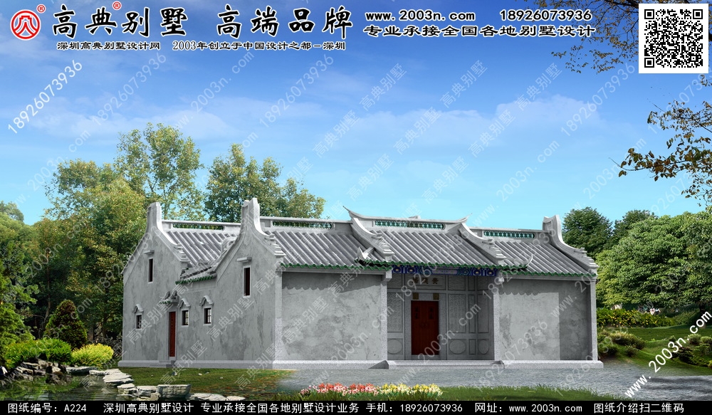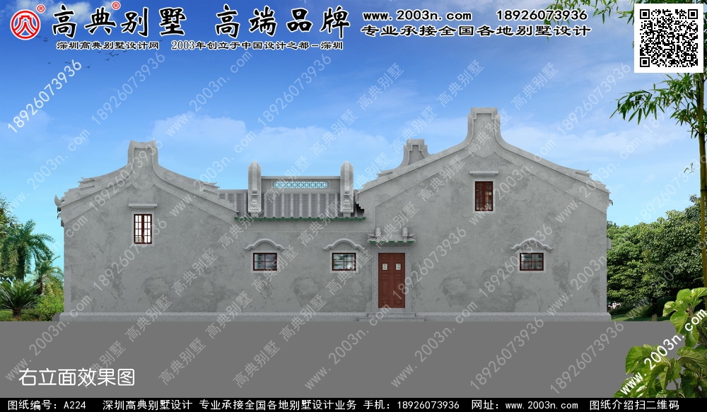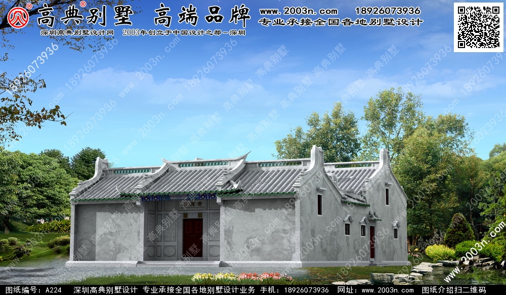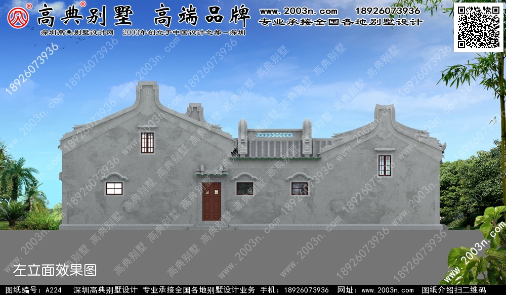A224号别墅外墙主要材料:仿古青瓦、仿古涂料、白麻石 |