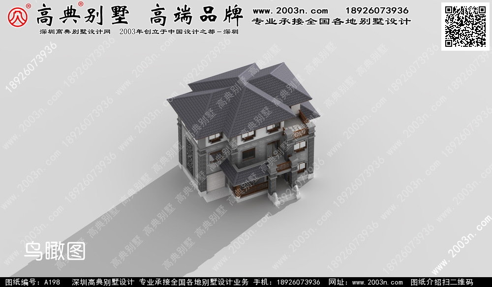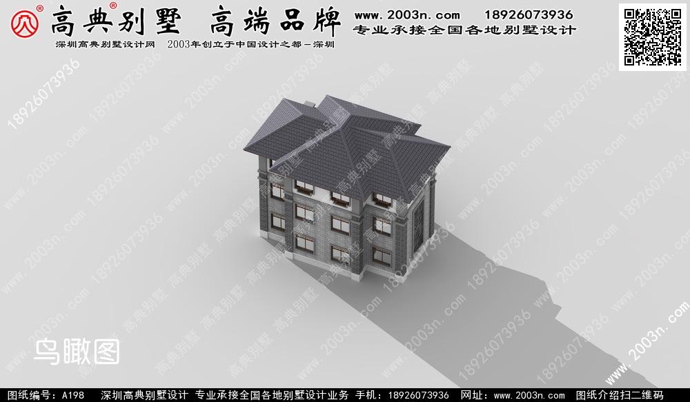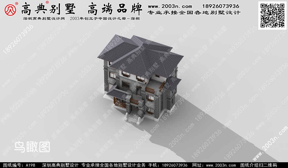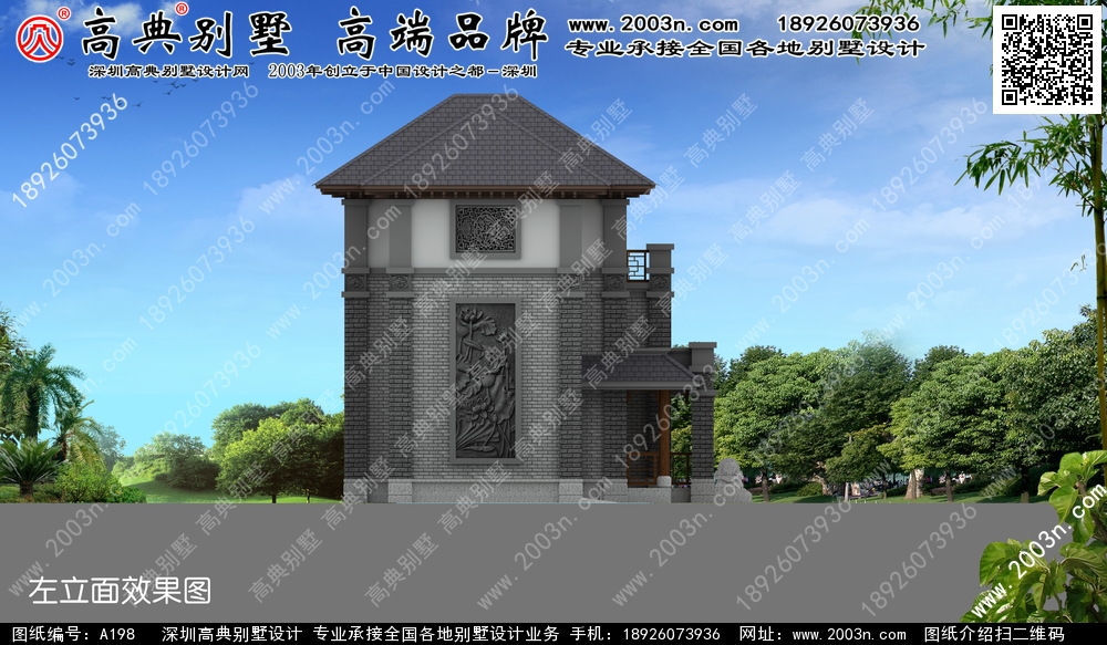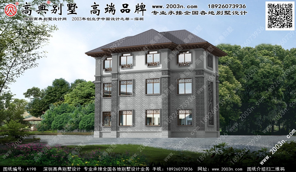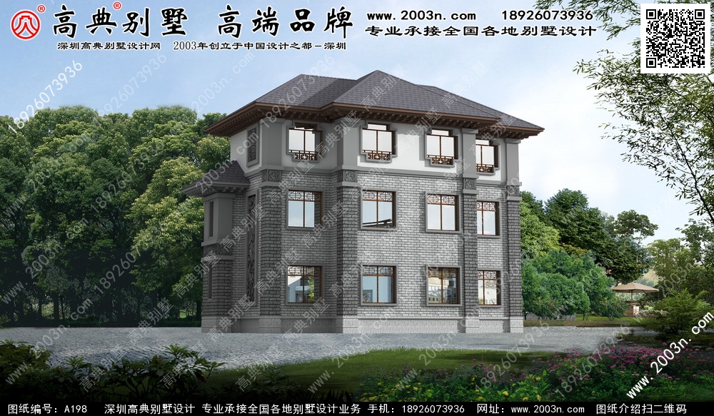 A198号别墅外墙主要材料: 水泥平板瓦、面砖、真石漆 、麻石 |