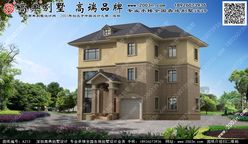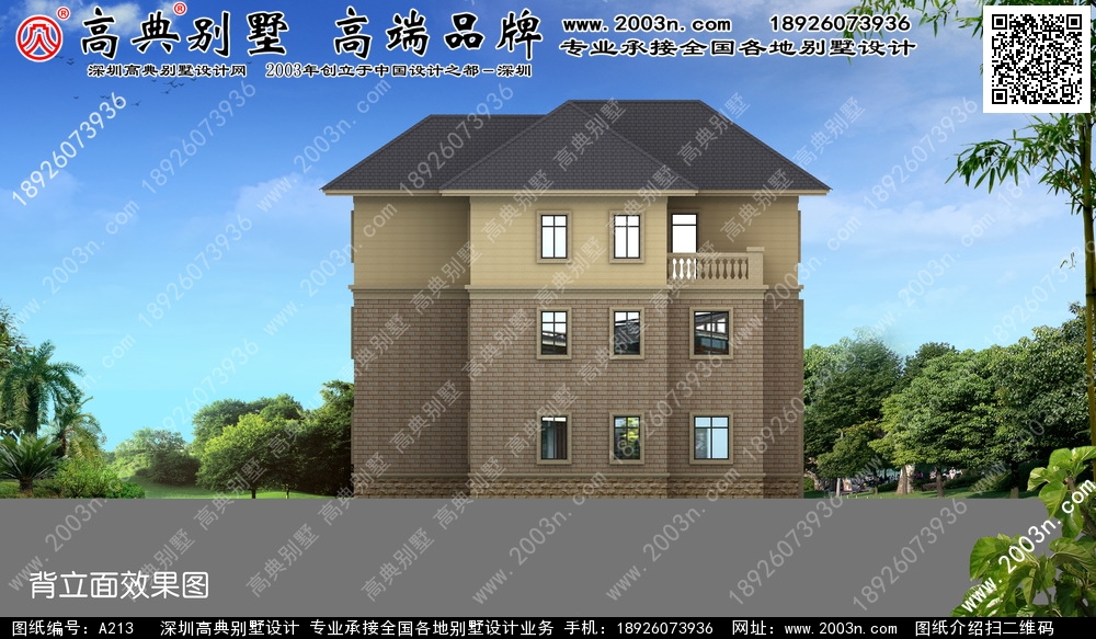 a213号别墅外墙主要材料: 外墙劈开砖、水泥构件葫芦柱栏杆、天然岩石漆、水泥构件线条、水泥平板瓦 |