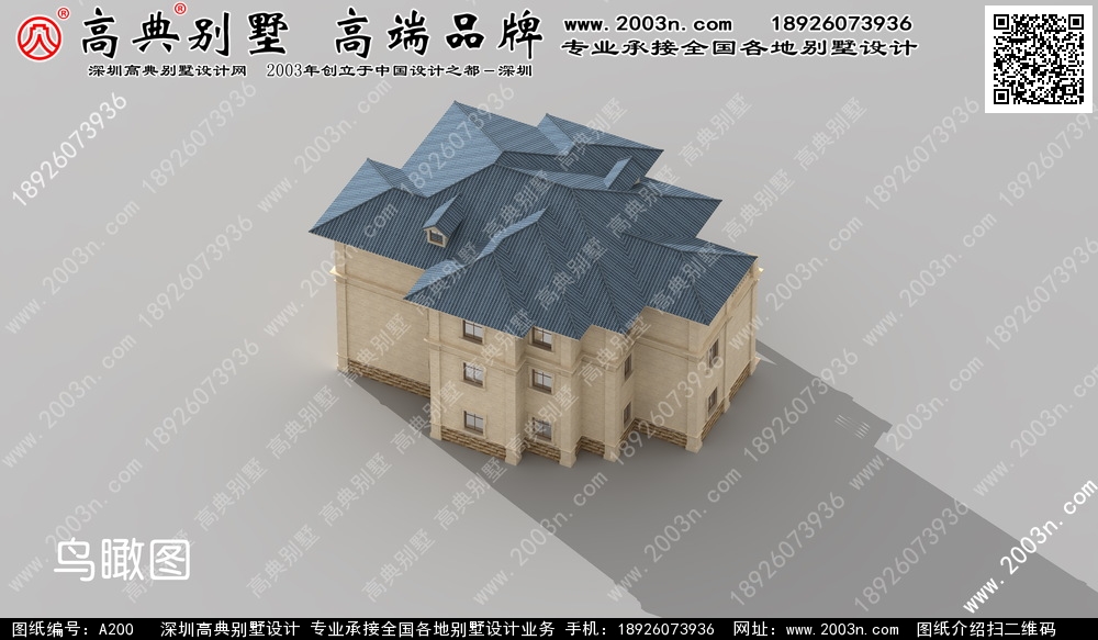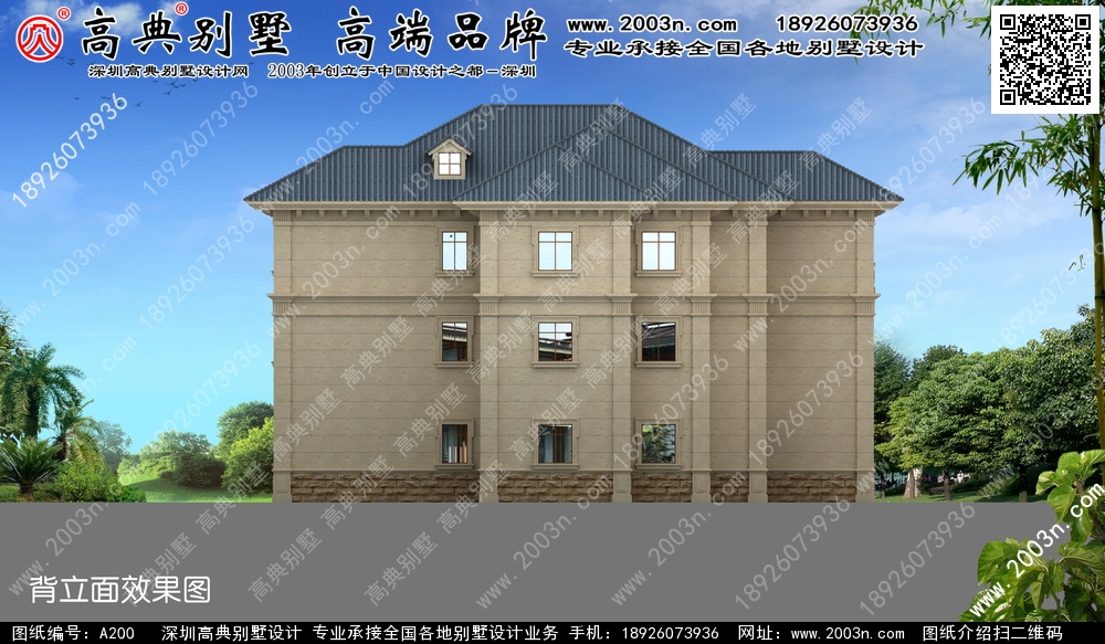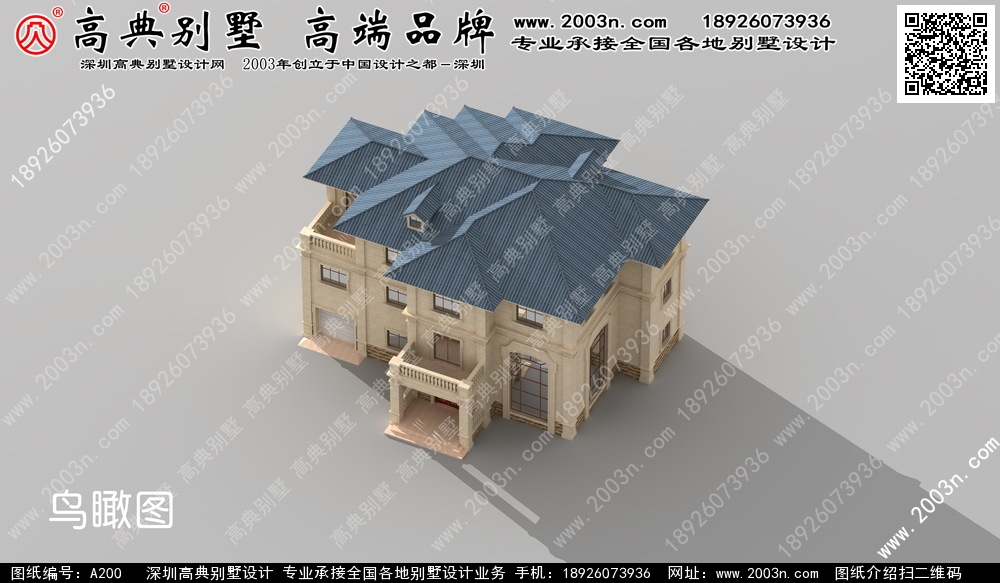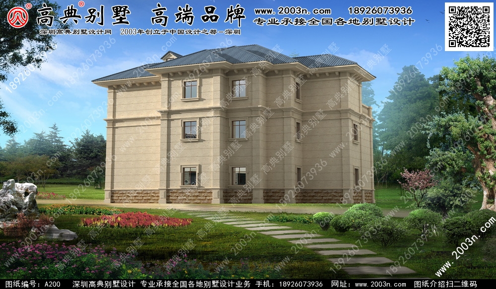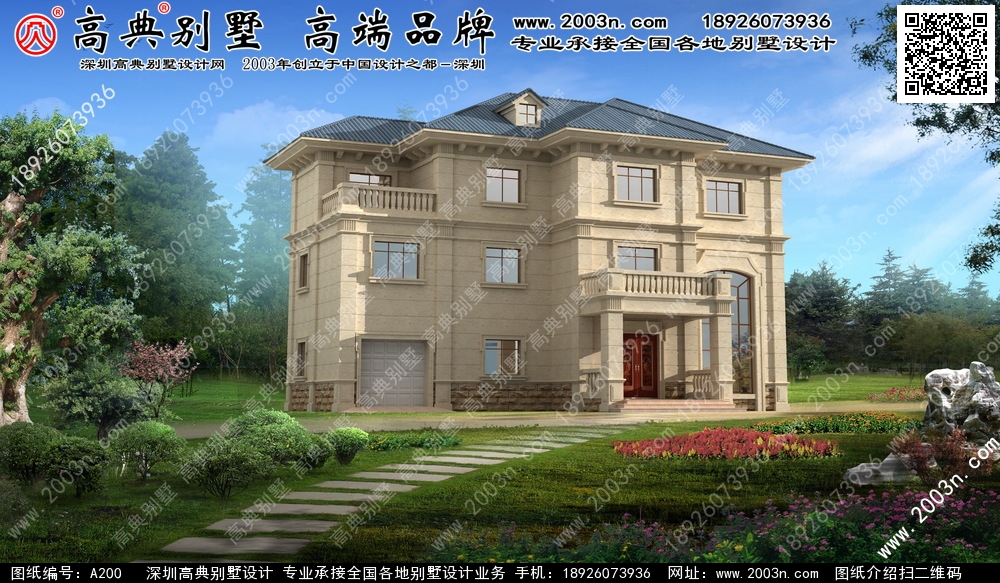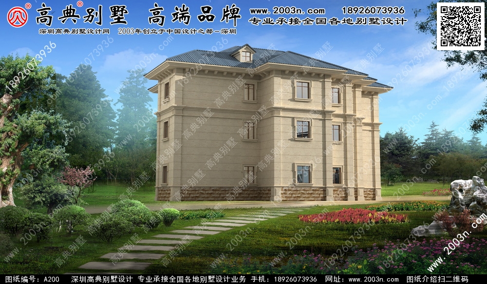 A200号别墅外墙主要材料:外墙纯石材干挂设计别墅、 外墙西班牙米黄石材、屋面310X310S瓦