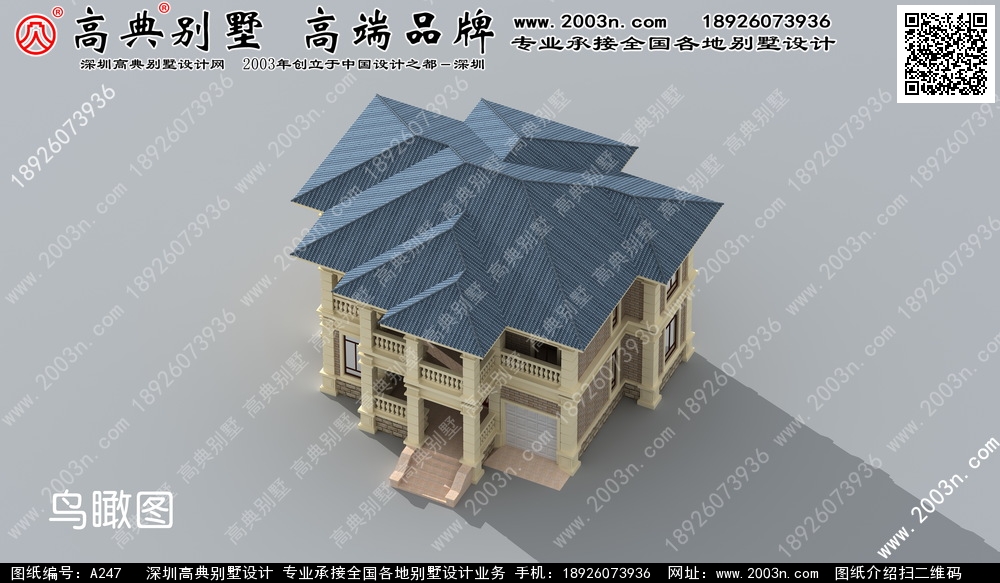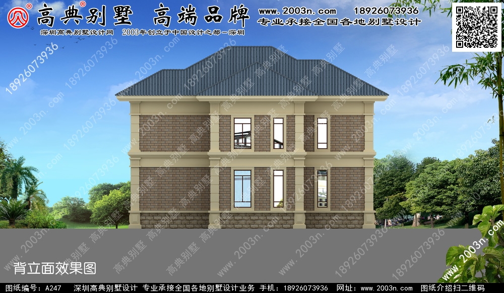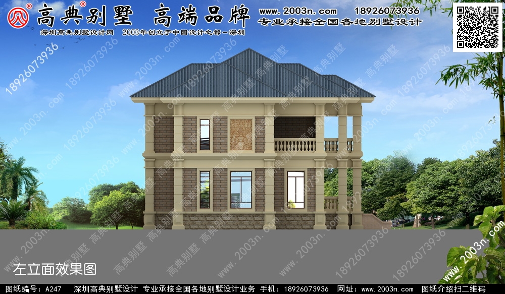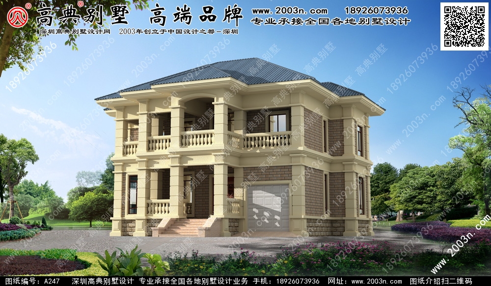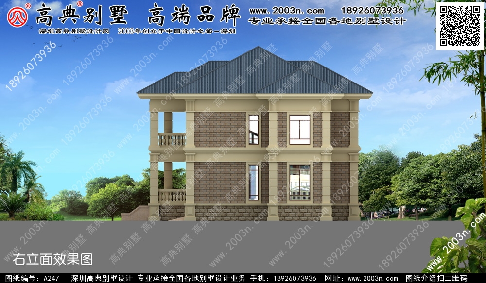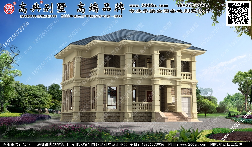 A247号别墅外墙主要材料: 310X310S瓦、真石漆、蘑菇面黄锈石、水泥构件 |