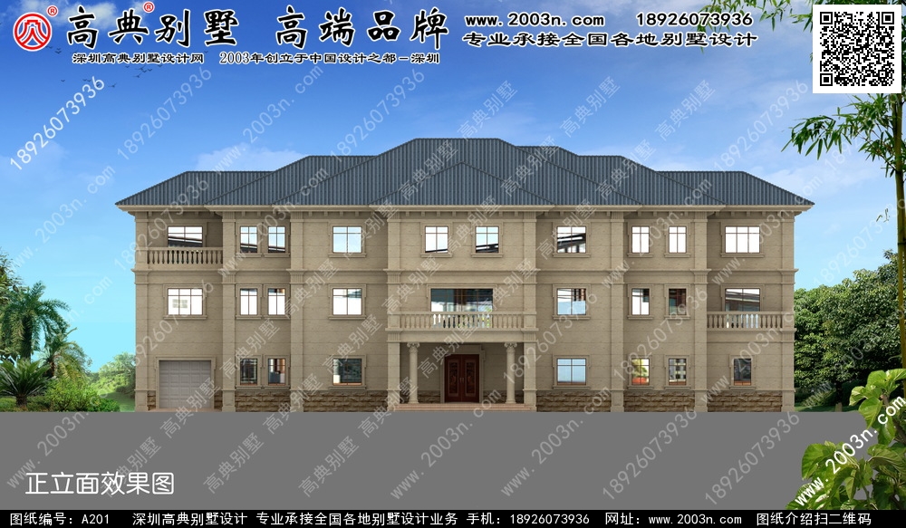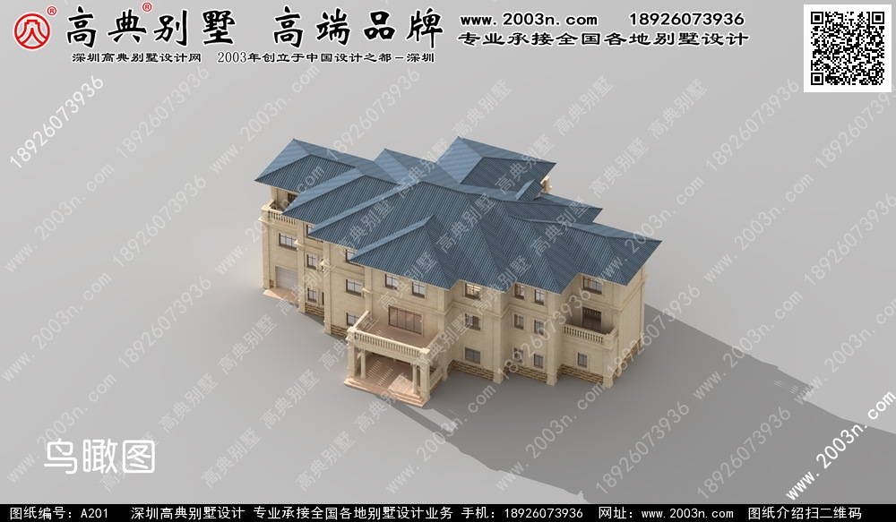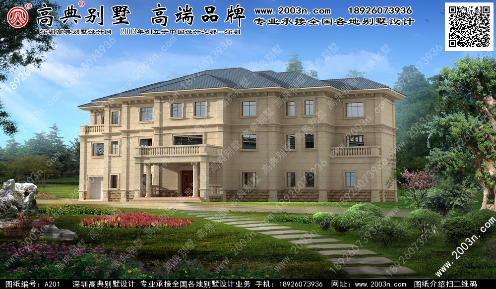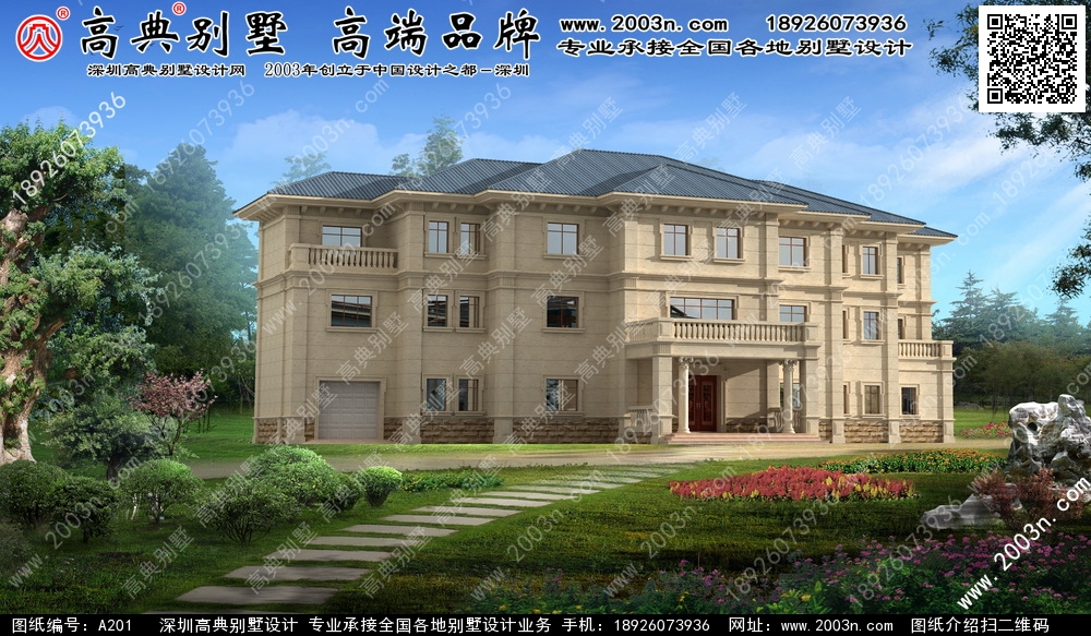 A201号别墅外墙主要材料: 外墙纯石材干挂设计别墅、 外墙西班牙米黄石材、屋面310X310S瓦 |