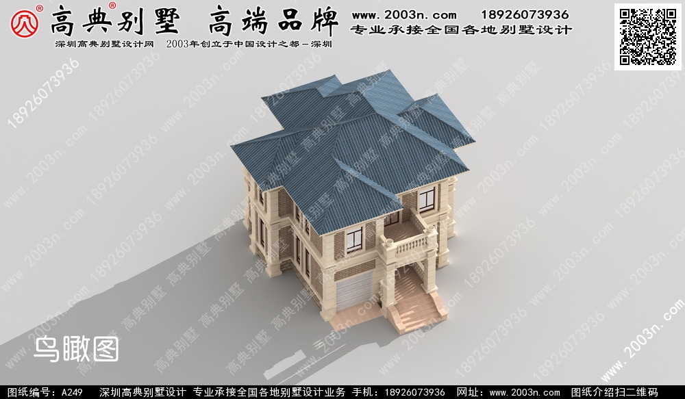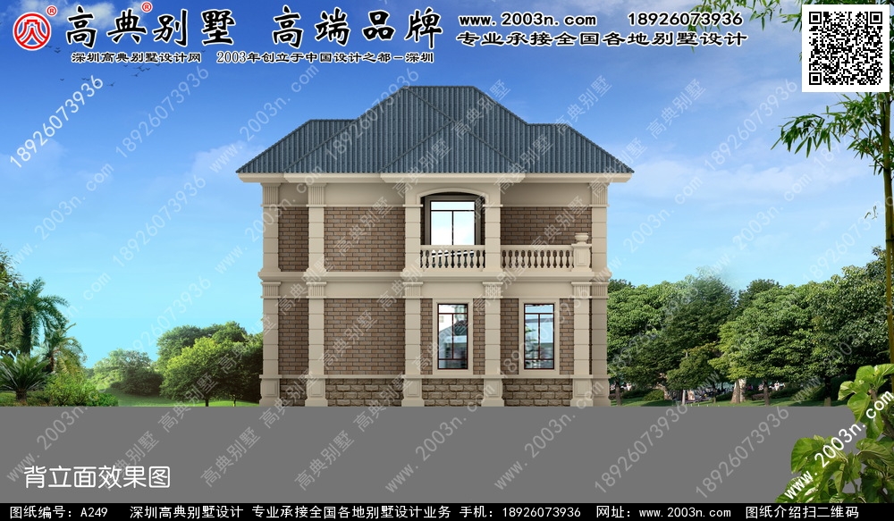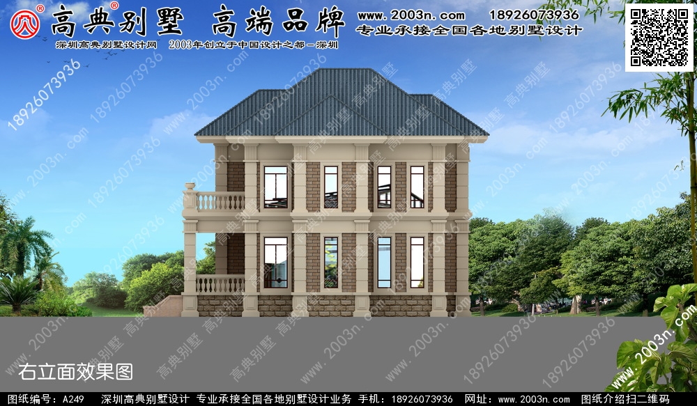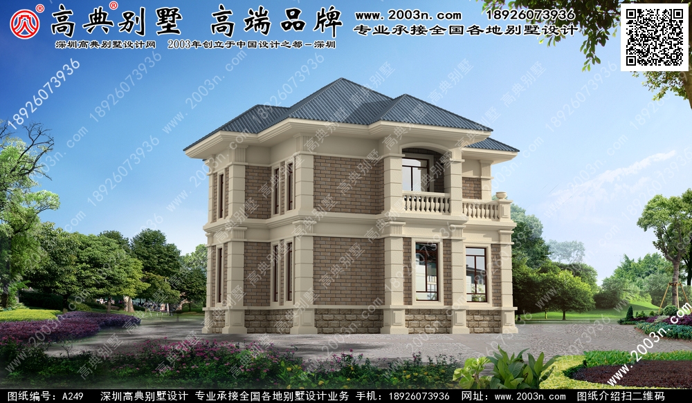 A249号别墅外墙主要材料: 310X310S瓦、真石漆、蘑菇面黄锈石、水泥构件 |
