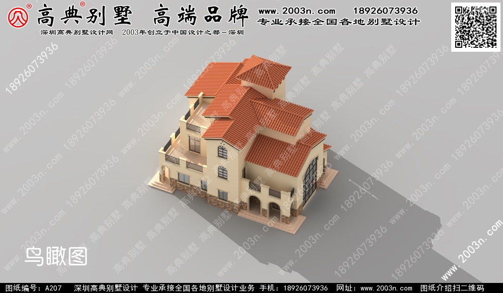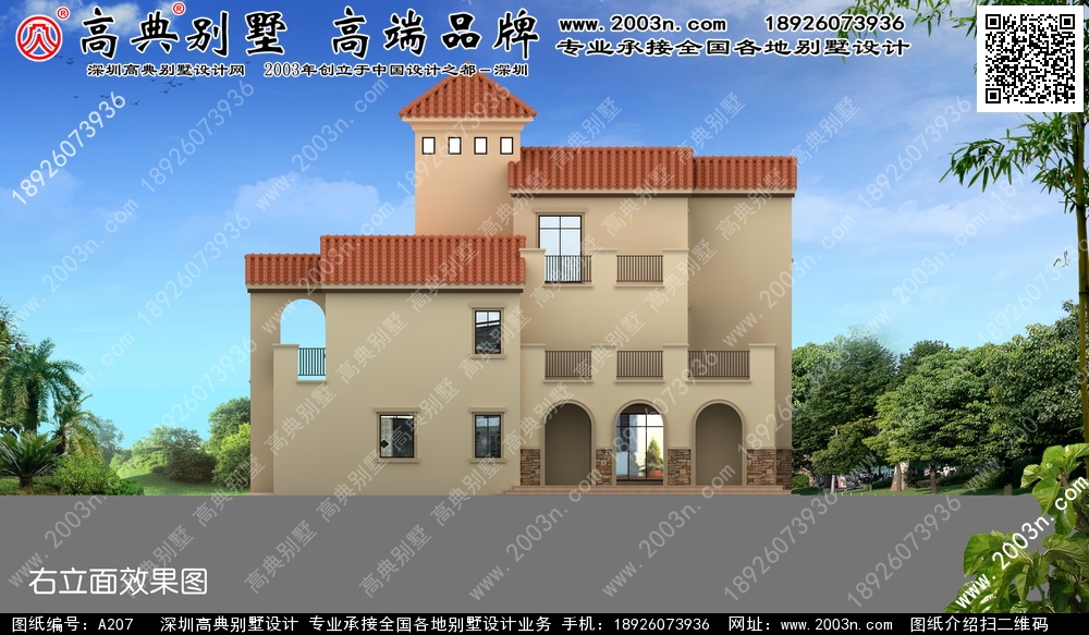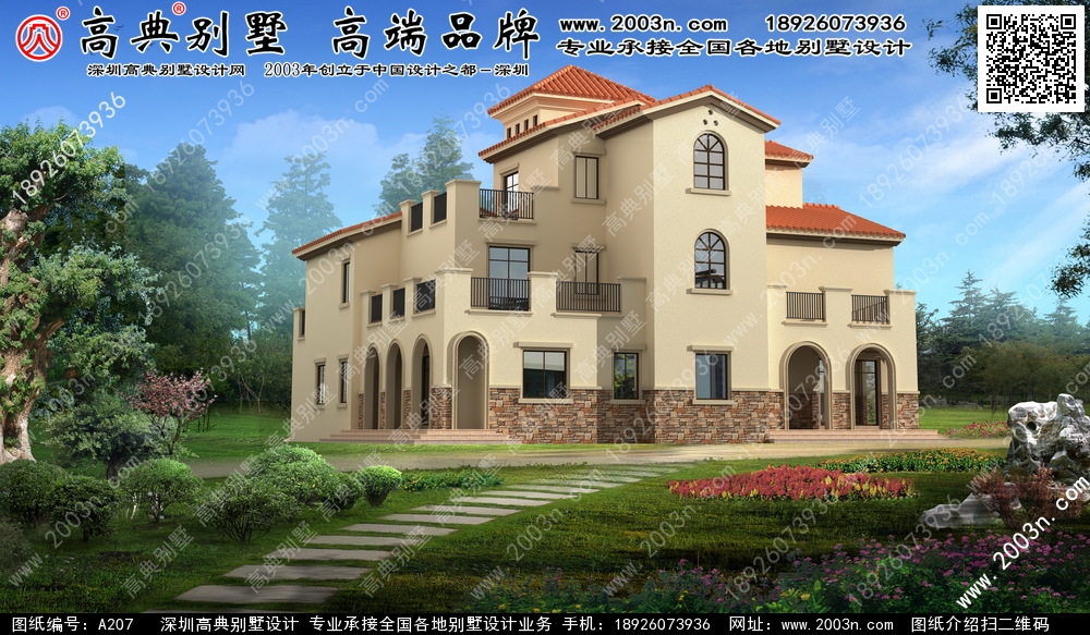 A207号别墅外墙主要材料:明黄色涂料、咖啡色涂料、铁艺栏杆、欧式水泥构件线条、外墙文化石、屋面西瓦 |