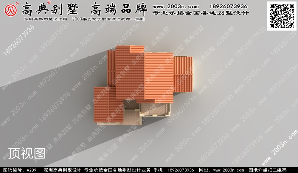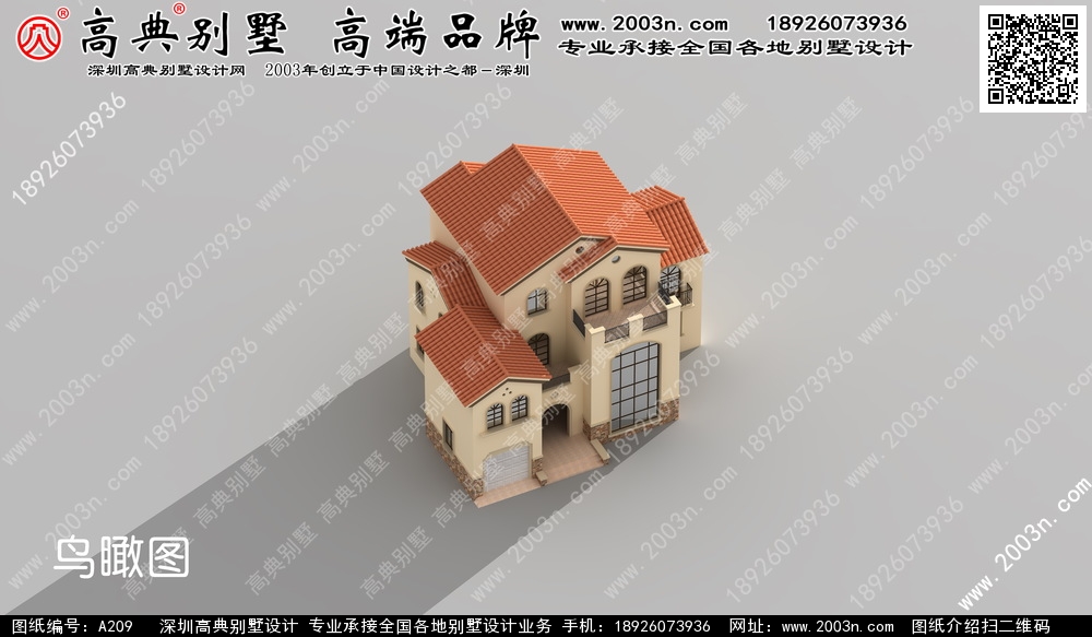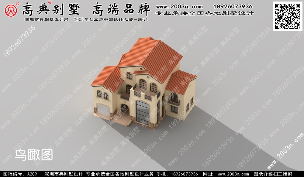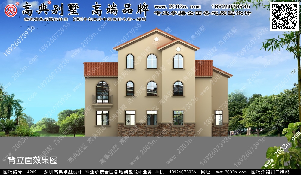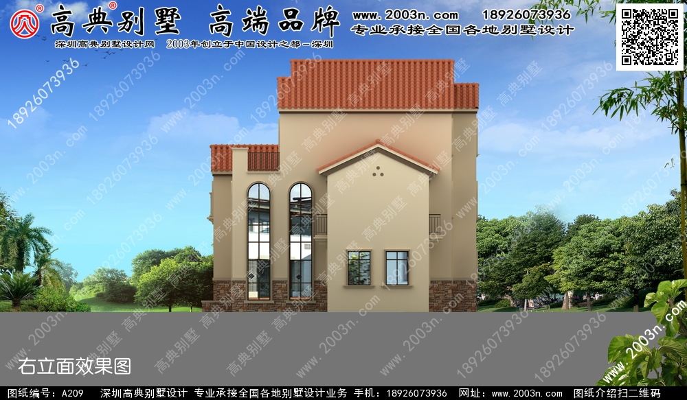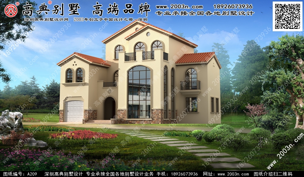 A209号别墅外墙主要材料:明黄色涂料、咖啡色涂料、铁艺栏杆、欧式水泥构件线条、外墙文化石、屋面西瓦 |